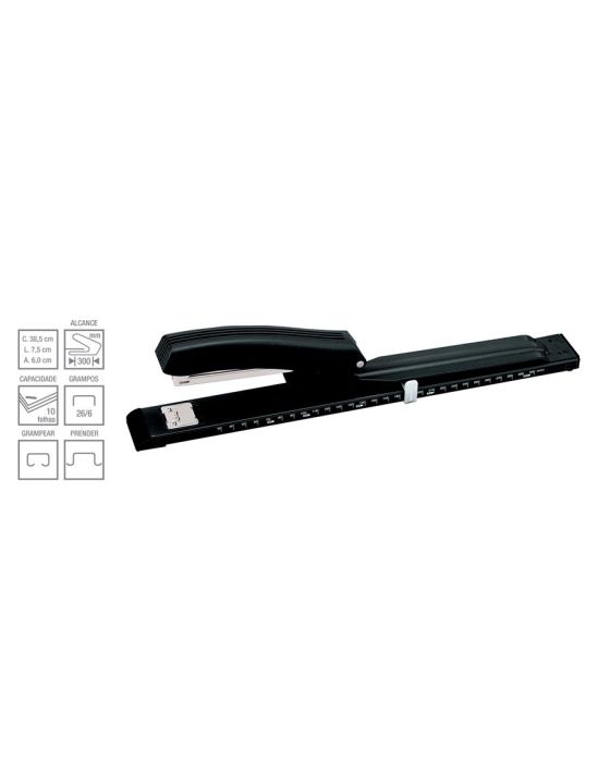 Caracteristicas: - Grampeador de longo alcance (300mm) - Grampos 26/6. - Capacidade: 10 folhas. - Estrutura metálica. - Apoio plástico. - Mecanismo de abastecimento de fácil operação. - 02 posições para fixação. - Medidas: C:38,5 x L:7,5 x A:6cm * As especificações podem ser alteradas sem aviso prévio ** Imagem meramente ilustrativa