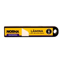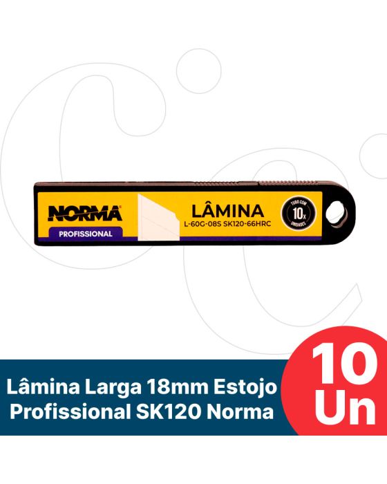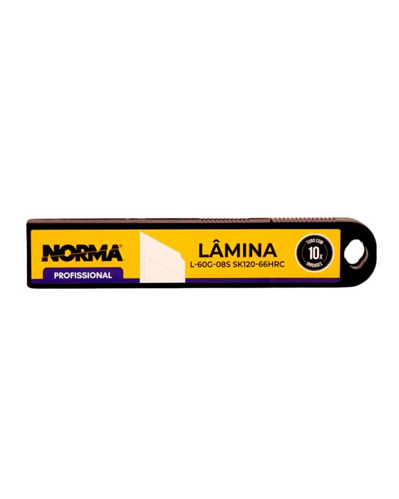 Características:- Lâmina larga profissional 18 mm para cortes pesados e precisos: A Lâmina Profissional Norma SK120 18 mm foi desenvolvida para aplicações que exigem alto desempenho, resistência e precisão. Fabricada no Japão em aço carbono JIS G 4401:2009-SK120 (SK2), apresenta elevada durabilidade e excelente retenção de fio, sendo indicada para uso profissional e industrial.- Construção segmentada com afiação em dois ângulos: Segmentada em oito partes, a lâmina permite a renovação rápida do fio de corte, mantendo a eficiência ao longo do uso. A afiação em dois ângulos proporciona cortes mais limpos e consistentes, mesmo em materiais densos e de maior resistência.- Desempenho ideal para trabalhos pesados: Indicada para cortes em borracha, carpete, couro, filmes laminados e pisos vinílicos, a lâmina larga de 18 mm oferece estabilidade e força durante a operação. É amplamente utilizada na indústria, na comunicação visual, em instaladores profissionais e em ambientes que demandam cortes repetitivos e precisos.- Praticidade e segurança no armazenamento: O produto é fornecido em estojo com 10 lâminas, facilitando o transporte, a organização e a reposição no ambiente de trabalho, além de contribuir para maior segurança no manuseio.- Sobre a marca Norma: A Norma é referência mundial em lâminas e ferramentas de corte, reconhecida pela qualidade de seus materiais, processos de fabricação rigorosos e alto padrão de desempenho.- Dimensões da embalagem: Comprimento: 11,5cm; Largura: 2,5cm; Altura: 1cm; Peso: 55g.ATENÇÃO! CONTÉM PARTES CORTANTES, MANTENHA FORA DO ALCANCE DAS CRIANÇAS. CUIDADO COM O MANUSEIO.* As especificações podem ser alteradas sem aviso prévio ** Imagem meramente ilustrativa.