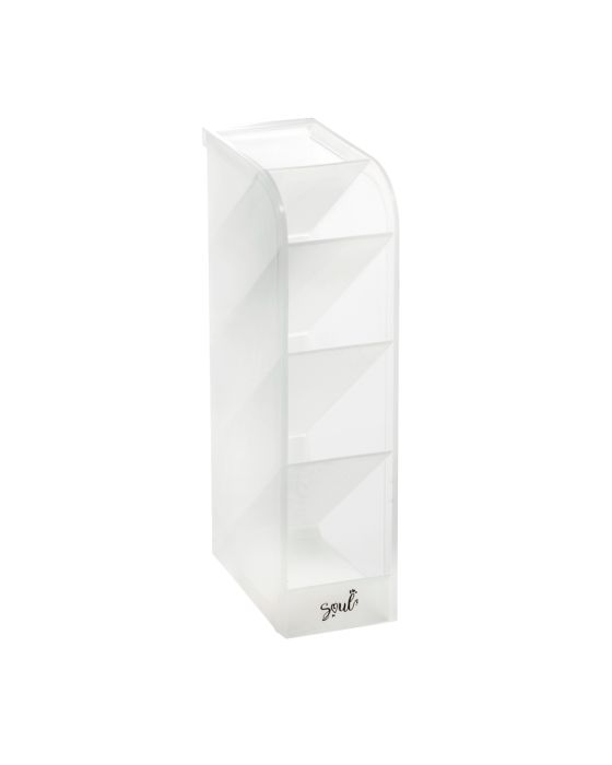 Características:Quem não precisa organizar a mesa do trabalho, do estudo ou até mesmo algum lugar da casa? Toda essa necessidade torna indispensável a presença do organizador multiuso da Brw! Compacto com 4 andares, pode ser utilizado tanto no sentido horizontal, quanto vertical para organizar e separar pequenos objetos.Detalhes:- Marca: BRW;- Modelo: Soul;- Referência: OR5000;- Linha: Organizadores;- Cor: Branco Translúcido;- Contém: 1 unidade do produto;- Possui 5 espaços para organizar canetas, lápis, maquiagens, etc;- Alta qualidade, resistência e durabilidade.Divisórias:- O 1º espaço de baixo para cima possui 5,4 x 4,5cm;- O 2º espaço de baixo para cima possui 4,8 x 4,5cm;- O 3º espaço de baixo para cima possui 4,8 x 4,5cm;- O 4º espaço de baixo para cima possui 3,4 x 4,5cm;- O 5º e ultimo espaço de baixo para cima possui 5,5 x 4,5cm.Composição:- Fabricado em poliestireno.Medidas:- Dimensões do produto: 4,5 x 9 x 20,1cm (LxPxA).* As especificações podem ser alteradas sem aviso prévio ** Imagem meramente ilustrativa.