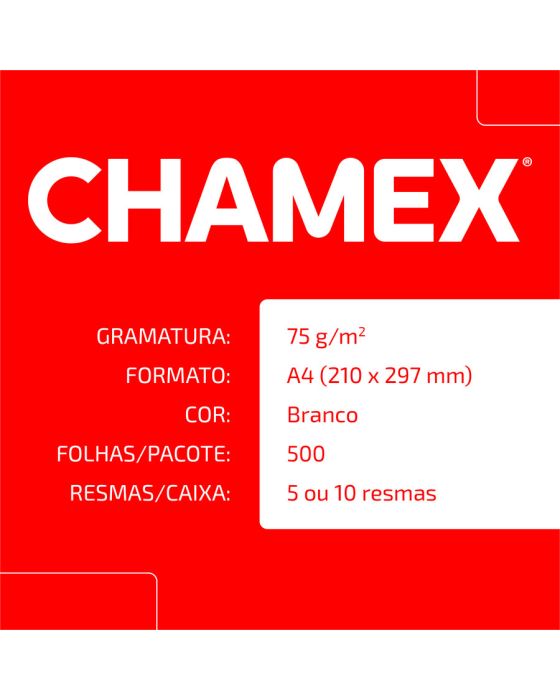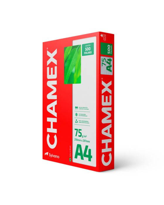 Características:Descubra o desempenho incomparável do Papel Sulfite A4 75g Chamex, referência em qualidade e confiabilidade para todas as suas atividades diárias. Seja para criar, escrever ou imprimir, Chamex entrega resultados profissionais e eficientes, garantindo impressões nítidas com excelente absorção e economia de tinta.- Superfície resistente e corte preciso: proporciona deslizamento suave na impressora, evitando desperdícios de papel e tinta;- Alta performance em volumes intensos: testado para suportar até 99% de não atolamento em lotes de 10.000 páginas em impressoras de alta velocidade (teste realizado pela International Paper nos EUA);- Cor branca de alta qualidade: fibras tratadas para máxima brancura e apresentação premium dos documentos;- Sustentabilidade: fabricado com eucalipto 100% renovável, possui certificação Cerflor, reforçando o compromisso ambiental da marca;- Versatilidade: indicado para uso em escritórios, escolas e home office, além de servir para impressões de textos, imagens, relatórios e apresentações.Especificações Técnicas:- Formato: A4 (210 x 297mm)- Gramatura: 75g/m²- Folhas por Resma: 500- Resmas por Caixa: 10- Certificação: Cerflor (manejo florestal responsável)*As especificações podem ser alteradas sem aviso prévio ** Imagem meramente ilustrativa.