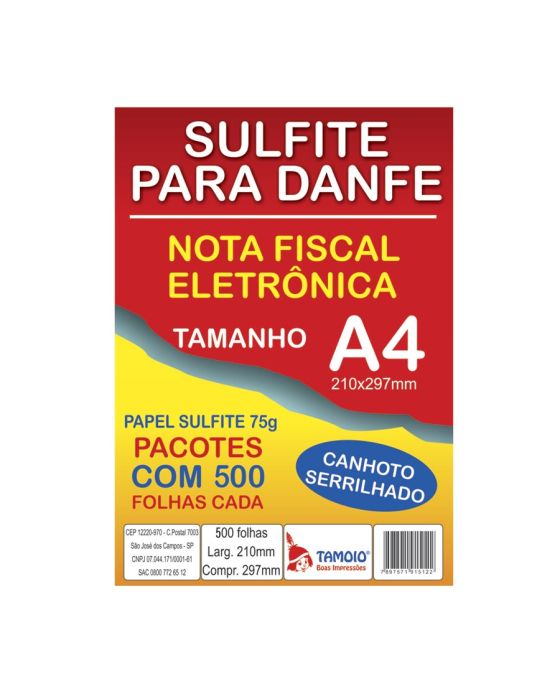 Características:Papel Sulfite A4 para Danfe(Nota Fiscal Eletrônica)Detalhes:- Tamanho: 210X297mm (A4)- Resma: 500 folhas- Papel Alcalino 75g/m Branco- Papel com canhoto Serrilhado com aproximadamente 2,50cm próprio para DANFE- Gramatura 75 gm²- Pode ser impresso em qualquer tipo de impressora * As especificações podem ser alteradas sem aviso prévio ** Imagem meramente ilustrativa.