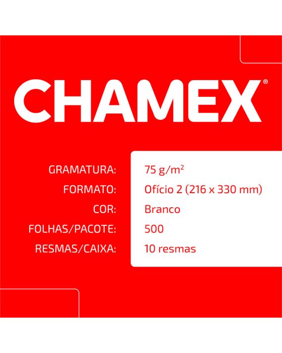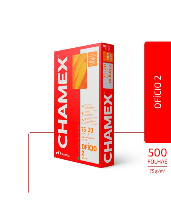 Caracteristicas:- As versões Ofício agora se unificam e passam a ser o novo Chamex Ofício 2 75. Ofício 2 serve perfeitamente para todos os públicos que necessitam da categoria Ofício em suas atividades. Tudo para você usar seu potencial criativo sem preocupações.- Suas impressões sairão com perfeição no novo Chamex Ofício 2. O papel possui superfície resistente e corte perfeito, o que resulta no melhor deslizamento do papel na impressora. Isso evita o desperdício de tinta e problemas na hora de imprimir materiais que serão importantes no seu dia a dia. Pensou diferente na hora de realizar aquele trabalho importante e usou sua criatividade? Chamex é o seu papel.99% de não atolamento- Chamex Ofício 2 garante excelente performance em equipamentos e impressoras de alta velocidade. - O teste foi realizado em laboratórios da International Paper nos EUA. Nesse teste, são impressos, continuamente, 10.000 folhas de papel em impressoras de alto volume e é aceitável 1 atolamento a cada 10.000 cópias. Os testes foram efetuados em equipamento multifuncional com velocidade de 180 páginas por minuto.- Para excelência nos resultados, é necessário que o papel seja armazenado em local adequado, isento de umidade e luminosidade excessiva, bem como isento de avarias que possam comprometer as características originais de fabricação do papel.- Importante: a qualidade do papel influencia no processo de impressão, porém os componentes dos equipamentos, assim como a manutenção e qualidade deles também são responsáveis.- A International Paper garante a qualidade do papel no processo de impressão.- Formato: Oficio 2 (216x330mm)- Gramatura: 75g/m2- Folhas/resma:500- Resma/caixa: 10- Certificação: Cerflor * As especificações podem ser alteradas sem aviso prévio ** Imagem meramente ilustrativa.