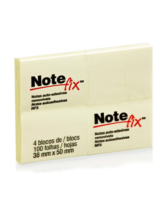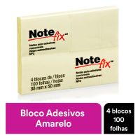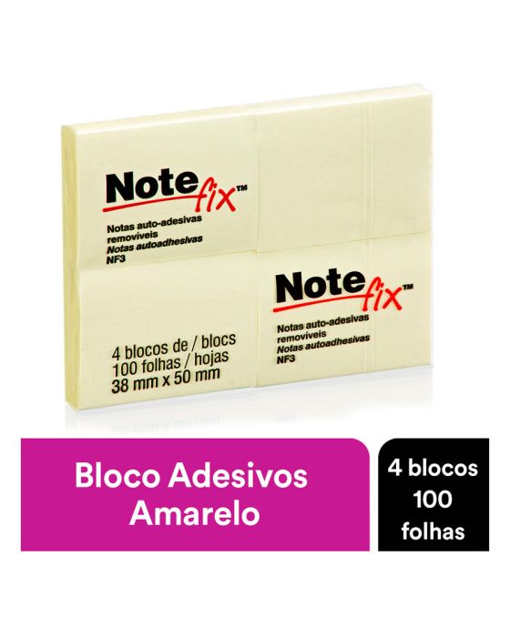 Características:Bloco de notas adesivas para anotar compromissos e recados.Detalhes:- Marca: Notefix™;- Fabricante: 3M;- Modelo: Bloco Adesivo Notefix™;- Referência: HB004088686;- Linha: Blocos de notas;- Cor: Amarelo;- Quantidade de folhas por bloco: 100 folhas;- Quantidade de blocos: 4 blocos;- Contém: 1 embalagem com 4 bloco de 100 folhas cada totalizando 400 folhas;- Medidas: 38 x 50mm (3,8 x 5cm);- Notas adesivas com qualidade 3M;- Permite deixar mensagens de forma prática e rápida.Aplicações sugeridas:- Ideal para fazer anotações e lembretes.Composição:- Adesivo: Papel tipo superbond com adesivo Acrílico sintético, removível e reposicionável.AVISO!- O adesivo pode deixar marcas em algumas superfícies ou remover tinta. Teste antes de usar!* As especificações podem ser alteradas sem aviso prévio ** Imagem meramente ilustrativa.