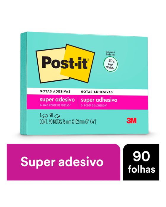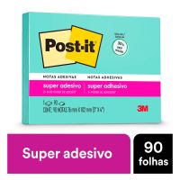 Caracteristicas:As notas adesivas Post-it® tamanho 76 mm x 102 mm são ideais para anotar qualquer coisa que você precisar. Ideal para colar em superfícies verticais. Os blocos adesivos são indispensáveis no seu dia-a-dia, garantindo maior organização.Suas folhas são reposicionáveis, pois possuem adesivo de qualidade 3M que permite que essas sejam retiradas e recolocadas sem danificar papéis ou outras superfícies. Não deixa resíduos do adesivo.Todo papel utilizado nas notas Post-it® é certificado pelo SFI (Chain of Custody Certified), o que garante que vem de florestas bem administradas, onde as árvores são replantadas.Detalhes:- Marca: Post-it®;- Fabricante: 3M;- Referência: HB004310015;- Linha: Notas adesivas;- Cor: Azul Água;- Quantidade de folhas: 90 folhas;- Quantidade de blocos: 1 bloco;- Contém: 1 embalagem com 1 bloco de 90 folhas;- Medidas: 76 x 102mm (7,6 x 10,2cm);- Possui um adesivo 2x mais forte do que o bloco Post-it®original;- Ideal para anotar recados e se organizar;- Gruda e desgruda: É reposicionavel;- Adesivo ideal para o uso em papel;- Reciclável;- Adesivo de base vegetal.Aplicações sugeridas:- Ótimos para deixar seus recados e lembretes sempre ao seu alcance.Composição:- Papel produzido a base de 30% de papel reciclado.AVISO!- O adesivo pode deixar marcas em algumas superfícies ou remover tinta. Teste antes de usar!Conteúdo da embalagem: 1 Post-it Azul Aqua 76 X 102 Mm 90 Folhas 3m.* As especificações podem ser alteradas sem aviso prévio ** Imagem meramente ilustrativa.