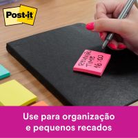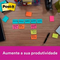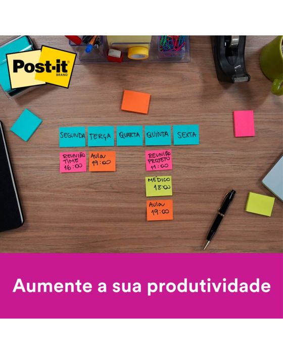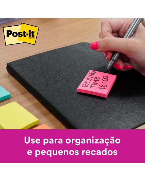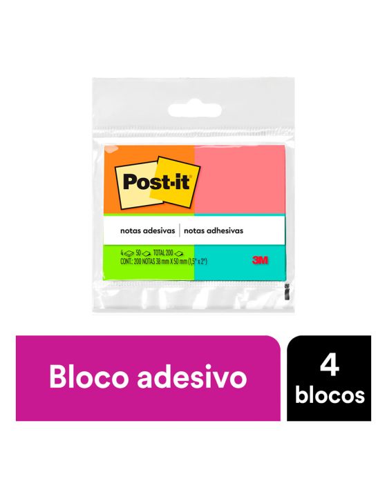 Caracteristicas:Ideal para pequenas anotações e lembretes.Suas folhas são reposicionáveis, pois possuem adesivo de qualidade 3M que permite que essas sejam retiradas e recolocadas sem danificar papéis ou outras superfícies. Não deixa resíduos do adesivo.Todo papel utilizado nas notas Post-it® é certificado pelo SFI (Chain of Custody Certified), o que garante que vem de florestas bem administradas, onde as árvores são replantadas.Detalhes:- Marca: Post-it®;- Fabricante: 3M;- Referência: HB004402267;- Linha: Notas adesivas;- Cor: Rosa, Verde, Amarelo e Laranja;- Quantidade de folhas: 200 folhas (50 blocos cada);- Quantidade de blocos: 4 blocos;- Contém: 1 embalagem com 1 bloco de 200 folhas;- Medidas: 38 x 50 mm (3,8 x 50cm);- Possui um adesivo 2x mais forte do que o bloco Post-it®original;- Ideal para anotar recados e se organizar;- Gruda e desgruda: É reposicionavel;- Adesivo ideal para o uso em papel;- Reciclável;- Adesivo de base vegetal.Aplicações sugeridas:- Cores diferentes que facilitam na organização, além de terem o tamanho ideal para anotações rápidas.Composição:- Papel com adesivo com base vegetal reposicionável.AVISO!- O adesivo pode deixar marcas em algumas superfícies ou remover tinta. Teste antes de usar!Conteúdo da embalagem: 1 Post-it Tropical 4 Blocos 38 X 50 Mm 200 Folhas 3m.* As especificações podem ser alteradas sem aviso prévio ** Imagem meramente ilustrativa.
