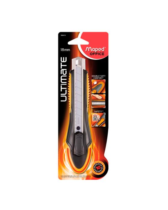 Caracteristicas:O Estilete 18mm Metal Ultimate Maped possui lâminas de alta qualidade, corpo emborrachado auxiliando na pegada garantindo maior segurança e conforto aos usuários!Detalhes:- Marca: Maped.- Modelo: Ultimate.- Referência: 086610.- Linha: Estilete.- Cor: Preto com Laranja.- Lâmina: 18mm.- Contém: 1 blister com 1 unidade do produto.- Uso: Recomendável para uso doméstico ou profissional.- Corpo: Emborrachado e macio.- Possui Trava de segurança.- Conforto duplamente suave.Validade indeterminada.Modo de uso:- Empurre a trava para cima até a Lâmina ficar 2mm acima do trilho.- Para guardar a lâmina, basta puxar a trava para baixo até o final.- Quando apresentar falha no corte, quebre a lâmina com falha no local indicado com auxílio do suporte localizado abaixo da trava.- Faça o descarte do pedaço destacado no lugar correto e seguro para evitar acidentes. Composição:- Corpo plástico com trilho e lâmina de metal.Precauções:- Cuidado, este produto corta de forma acurada.ATENÇÃO! PRODUTO NÃO RECOMENDÁVEL PARA MENORES DE 3 (TRÊS) ANOS POR CONTER PARTE(S) CORTANTE(S).* As especificações podem ser alteradas sem aviso prévio ** Imagem meramente ilustrativa.