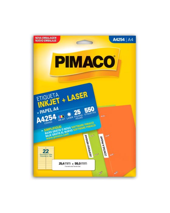 Características: - Dimensões da etiqueta : 2,54 x 9,90 cm- Quantidade de etiquetas por embalagem: 550 etiquetas- Quantidade de etiquetas por folha: 22 etiquetas- Cor: branco- Etiqueta retangular- Adesivo permanenteDicas de uso:• Etiquetas brancas para impressoras e copiadoras em folhas formato A4.• Ideal para uso em correspondências, pastas, documentos, caixas, pequenos objetos entre outros.• Utilize o software Pimaco para facilitar a impressão: www.pimaco.com.* As especificações podem ser alteradas sem aviso prévio ** Imagem meramente ilustrativa