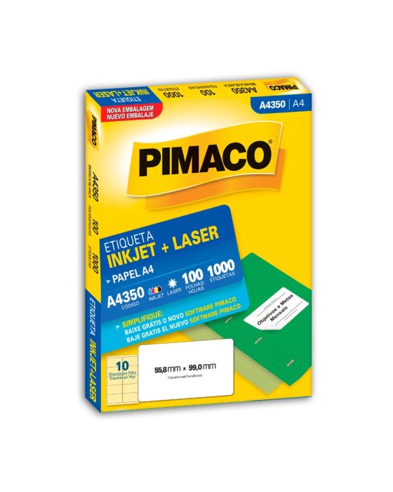 Características:- Etiquetas adesivas de alta precisão para impressões profissionais: A Etiqueta Adesiva Pimaco Laser/Inkjet A4 350 (55,8 x 99,0 mm) foi desenvolvida para oferecer qualidade superior de impressão e aderência consistente, atendendo demandas profissionais e organizacionais. Compatível com impressoras jato de tinta e laser, proporciona resultados nítidos, alinhamento preciso e excelente desempenho em grandes volumes de impressão.- Compatibilidade total e impressão otimizada: O formato padrão A4 e o revestimento especialmente preparado garantem excelente ancoragem da tinta e toner, evitando borrões, falhas de leitura e desgaste prematuro. Cada folha contém 10 etiquetas retangulares com adesivo permanente, assegurando fixação firme em superfícies variadas, como plástico, papel, vidro e papelão.- Adesão durável e acabamento limpo: O adesivo permanente das etiquetas Pimaco oferece excelente aderência, ideal para aplicações que exigem fixação segura sem risco de descolamento involuntário. O corte preciso facilita o destacamento e aplicação, reduzindo tempo de preparo e garantindo acabamento profissional em todas as impressões.- Alta produtividade para grandes demandas: Com 100 folhas e um total de 1.000 etiquetas por embalagem, o modelo A4350 é ideal para operações que exigem padronização e volume, como expedição, identificação de produtos, catalogação, arquivamento e organização corporativa. O tamanho de 55,8 x 99,0 mm proporciona espaço adequado para textos, códigos de barras e pequenos gráficos.- Aplicações e versatilidade: Indicadas para correspondências, pastas, caixas, documentos, pequenos objetos e rotinas logísticas, as etiquetas são amplamente utilizadas em escritórios, estoques, comércios, escolas e ambientes industriais leves. O uso do software Pimaco facilita a criação de layouts padronizados e aumenta a precisão das impressões.- Sobre a marca Pimaco: A Pimaco, tradicional no mercado de etiquetas adesivas, é reconhecida pela qualidade, durabilidade e ampla compatibilidade de seus produtos.- Dimensões da embalagem:Comprimento: 30,1cm;Largura: 2cm; Altura: 22cm;Peso: 1.163kg.* As especificações podem ser alteradas sem aviso prévio ** Imagem meramente ilustrativa.