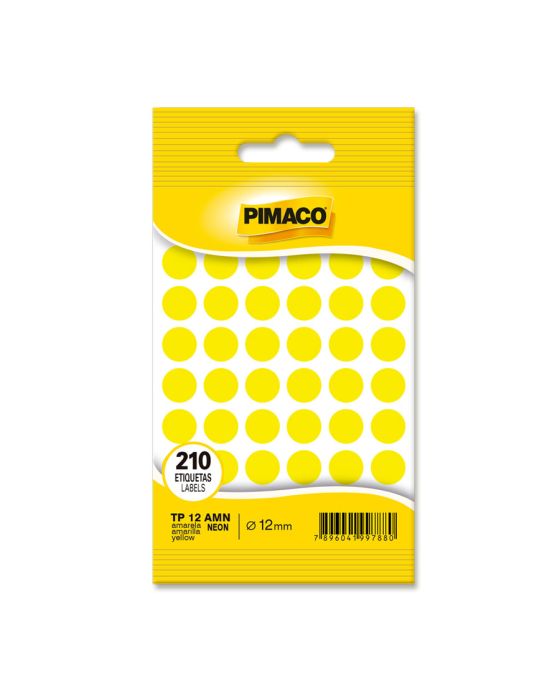 Caracteristicas:As etiquetas PIMACO podem ser amplamente utilizadas no trabalho ou em casa, sempre mantendo um alto nível de apresentação. São diversos e modelos e quantidades para suprir qualquer demanda.Detalhes:- Marca: Pimaco.- Modelo: TP-12 AMN.- Linha: Etiquetas.- Formato: Redondo.- Cor: Amarelo Neon.- Quantidade total de etiquetas: 210 etiquetas.- Quantidade por folha: 42 etiquetas.- Quantidade de folhas: 5 folhas.- Carreira: 6 fileiras com 7 etiquetas.- Tamanho da etiqueta: Ø12mm.Onde usar:- Ideal para organização de produtos, catálogos, índices, lacrar envelopes e etc.Composição:- Papel ou película de plástico transparente com adesivo acrílico aquoso.Validade Indeterminada.* As especificações podem ser alteradas sem aviso prévio ** Imagem meramente ilustrativa.
