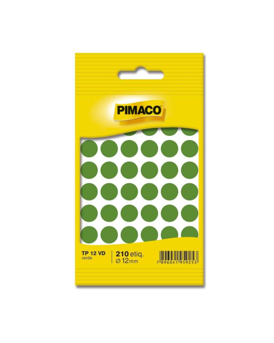 Caracteristicas:As etiquetas PIMACO podem ser amplamente utilizadas no trabalho ou em casa, sempre mantendo um alto nível de apresentação. São diversos e modelos e quantidades para suprir qualquer demanda.Detalhes:- Marca: Pimaco.- Modelo: TP-12 VD.- Linha: Etiquetas.- Formato: Redondo.- Cor: Verde.- Quantidade total de etiquetas: 210 etiquetas.- Quantidade por folha: 42 etiquetas.- Quantidade de folhas: 5 folhas.- Carreira: 6 fileiras com 7 etiquetas.- Tamanho da etiqueta: Ø12mm.Onde usar:- Ideal para organização de produtos, catálogos, índices, lacrar envelopes e etc.Composição:- Papel ou película de plástico transparente com adesivo acrílico aquoso.Validade Indeterminada.* As especificações podem ser alteradas sem aviso prévio ** Imagem meramente ilustrativa.