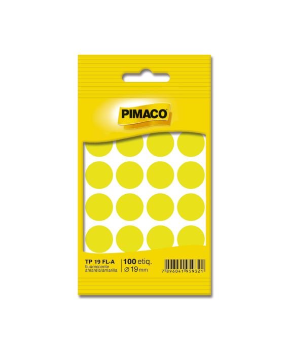 Caracteristicas:As etiquetas PIMACO podem ser amplamente utilizadas no trabalho ou em casa, sempre mantendo um alto nível de apresentação. São diversos e modelos e quantidades para suprir qualquer demanda.Detalhes:- Marca: Pimaco.- Modelo: TP-19 AM.- Linha: Etiquetas.- Formato: Redondo.- Cor: Amarela Fluorescente.- Quantidade total de etiquetas: 100 etiquetas.- Quantidade por folha: 20 etiquetas.- Quantidade de folhas: 5 folhas.- Carreira: 4 fileiras com 5 etiquetas.- Tamanho da etiqueta: Ø19mm.Onde usar:- Ideal para organização de produtos, catálogos, índices, lacrar envelopes e etc.Composição:- Papel ou película de plástico transparente com adesivo acrílico aquoso.Validade Indeterminada.* As especificações podem ser alteradas sem aviso prévio ** Imagem meramente ilustrativa.