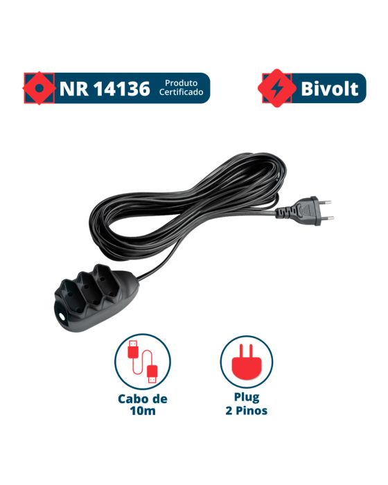 Características:- Praticidade e alcance ampliado para seu dia a dia: A extensão elétrica Intelbras com 3 tomadas padrão NBR 14136, plugue de 2 pinos e cabo de 10 metros é ideal para situações que exigem maior distância entre os pontos de energia e os equipamentos. Compacta, segura e eficiente, possibilita alimentar múltiplos dispositivos ao mesmo tempo, garantindo mobilidade e organização em ambientes residenciais e corporativos.- Segurança em primeiro lugar: Produzida com materiais antichamas e projetada segundo os mais altos padrões de qualidade, a extensão conta com certificação Inmetro, atestando a confiabilidade em sua utilização. Sua construção robusta reduz riscos elétricos e assegura o uso seguro em diferentes cenários.- Compatibilidade elétrica versátil: Totalmente bivolt automática (100 ~ 240Vac), a extensão se adapta às diferentes redes elétricas do país, operando em 127V (potência máxima 1.270W) e 220V (potência máxima 2.200W) com corrente máxima de 10A. Essa característica a torna uma solução prática para conectar desde eletroportáteis leves até dispositivos eletrônicos de uso cotidiano.- Construção inteligente e eficiente: Equipada com cabo flexível plano 2x0,75mm², garante boa resistência mecânica e facilidade de manuseio. Seu design com 3 tomadas de 2 pinos permite a ligação simultânea de equipamentos compatíveis, proporcionando organização e funcionalidade sem ocupar muito espaço.- Aplicações ideais: Projetada para uso interno, a extensão é indicada para residências, escritórios, home offices, salas de reunião e espaços comerciais, oferecendo confiabilidade e praticidade no fornecimento de energia em longas distâncias.- Marca de confiança: A Intelbras é referência nacional em tecnologia e soluções para energia, segurança e conectividade. Reconhecida pela qualidade e confiabilidade de seus produtos, a marca combina inovação com foco na segurança dos usuários.- Especificações do produto:Potência máxima de operação: 1.270W (127V) / 2.200W (220V)Frequência: 50/60 HzCor: PretoMaterial: Antichamas.- Itens inclusos na embalagem: 1 Extensão Elétrica EXT 2010 Intelbras .- Dimensões da embalagem:Comprimento: 26,3m;Largura:14,5cm;Altura: 3,7cm;Peso: 431g.* As especificações podem ser alteradas sem aviso prévio ** Imagem meramente ilustrativa.