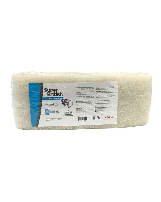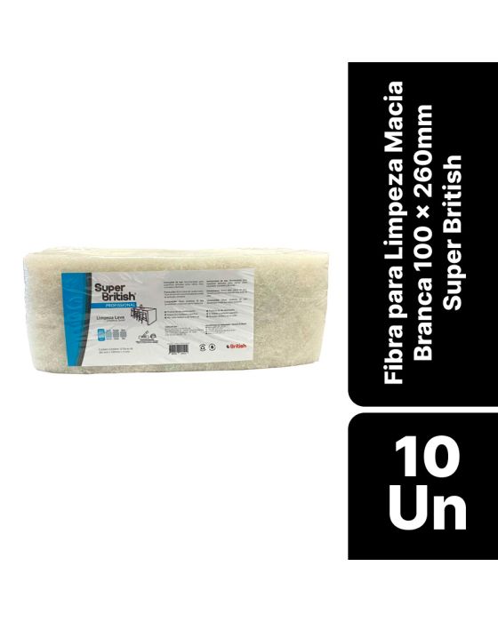 Características:- Desenvolvida para aplicações profissionais, a fibra macia branca Super British é indicada para a higienização de superfícies delicadas com sujidade leve. Sua composição com fibras sintéticas e abrasivos suaves garante uma limpeza eficaz sem risco de danificar materiais sensíveis.- Desempenho técnico e durabilidade: Produto de alta performance com excelente resistência mecânica. Adapta-se a qualquer superfície, não enferruja e não solta resíduos durante o uso. Por se tratar de um produto abrasivo leve, recomenda-se realizar testes prévios em uma pequena área da superfície. Nunca utilizar a seco.- Composição e segurança no uso: Fabricada com fibras sintéticas combinadas a abrasivos suaves, unidos por resina de alta resistência. Proporciona uma limpeza controlada, com baixo risco de causar arranhões, desde que utilizado conforme as recomendações.- Aplicações recomendadas: Indicada para limpeza profissional de superfícies delicadas, como aço inox, vidros, fórmicas, espelhos e metais cromados. Ideal para ambientes industriais, cozinhas profissionais, hospitais, laboratórios e locais que requerem limpeza eficaz sem agredir os materiais.- Super British: Desenvolve soluções profissionais para limpeza industrial, com foco em durabilidade, eficiência e resistência. Sua linha inclui fibras, discos e esponjas projetados para suportar o uso contínuo e intenso do setor profissional.- Dimensões do produto:Comprimento: 26cm;Largura: 10cm;Altura: 1,1cm;Peso: 19g.- Dimensões da embalagem:Comprimento: 26cm;Largura: 11cm;Altura: 10cm;Peso: 189g.* As especificações podem ser alteradas sem aviso prévio ** Imagem meramente ilustrativa.