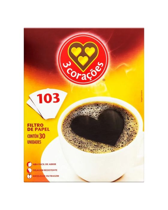 Caracteristicas:O Filtro de Papel 103 3 Corações possui textura especial e selagem super-resistente, que proporcionam uma filtragem mais rápida, preservando o verdadeiro sabor do seu café. Nosso cuidado permite que cada xícara de seu café saia perfeita para você. Experimente!Contém: 30 unidadesComposição: 100% Celulose1- Coloque o filtro de papel 3 Corações em um porta-filtro 103, dobrando o fundo e a lateral marcados. O porta-filtro deverá estar limpo e seco.2- Ajuste o porta-filtro sobre um bule, jarra ou garrafa. Coloque o pó de café dentro do filtro, na quantidade desejada.3- Adicione água fervente aos poucos, no centro do filtro. Não mexa a mistura com colher. Adoce a gosto.* As especificações podem ser alteradas sem aviso prévio ** Imagem meramente ilustrativa.