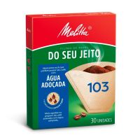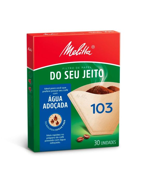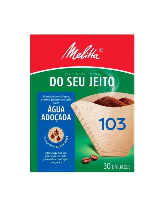 Caracteristicas:Pensando em você que prefere preparar seu café com água adoçada, os especialistas em preparo da Melitta® desenvolveram a tecnologia sugar fiber. Ela possui maior espaço entre as fibras e permite que a água adoçada passe mais rápido pelo filtro, resultando euma extração que ressalta o máximo do sabor e aroma do verdadeiro café fresquinho.Detalhes:- Marca: Melitta®.- Modelo: Do seu Jeito - 103.- Linha: Filtro de papel para café.- Tipo:Água adoçada.- Contém: 1 embalagem com 30 unidades- Tecnologia Sugar Fiber.- Maior espaço entre as fibras.- Café fresquinho para sentir mais a vida.- Mais rapidez no preparo do café passado com água adoçada.Modo de usar:- Dobre o filtro de papel nas áreas indicadas e coloque-o no suporte para filtro 103 (Grande).- Para preparar 20 xícaras de café de 50ml, coloque 4 colheres de sopa bem cheias (equivalente a 80g) de pó no filtro.- Sempre segurando a alça do suporte para filtro, acrescente 1 litro de água adoçada a gosto de forma lenta e contínua, evitando o preparo diretamente sobre uma garrafa térmica.Produto com certificações: FSC® C014015 e FSC® C142450* As especificações podem ser alteradas sem aviso prévio ** Imagem meramente ilustrativa.