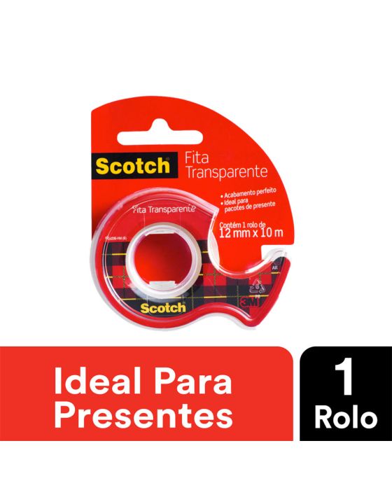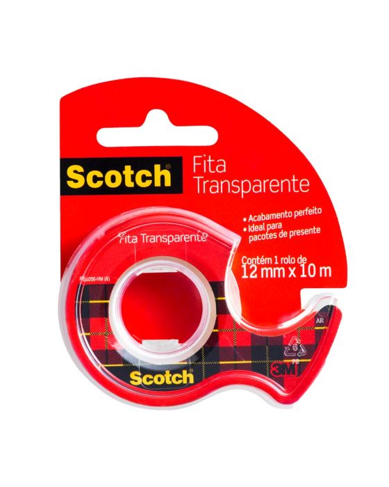 Caracteristicas:A Fita Adesiva Scotch® Transparente é perfeita para pacotes e presentes que exigem acabamentos finos. Pode ser usada em tarefas domésticas, no escritório e no comércio.O filme da Fita Adesiva Scotch® Transparente é mais espesso, para evitar quebras e proporcionar mais facilidade para achar a ponta. O corte é fácil e o desenrolamento é suave e sem barulho.Detalhes:- Marca: Scotch®;- Fabricante: 3M;- Referência: HB004087423;- Linha: Fitas adesivas;- Cor: Transparente;- Contém: 1 embalagem com 1 unidade do produto;- Medidas: 12mm x 10m;- Acompanha: suporte que te ajuda a evitar o desperdício e a perda da ponta, facilitando o corte da fita;- Corte fácil, desenrolamento suave e sem barulho;- Filme mais espesso, evitando quebras e é mais fácil achar a ponta;- Eficiente, a Fita Adesiva Scotch® Transparente cola com maior qualidade e fixa por mais tempo.Aplicações sugeridas:- Perfeita para pacotes e presentes que exijam acabamentos finos, pois é transparente e possui acabamento brilhante.Composição:- Fita: constituída de um dorso de filme de polipropileno bi-orientado (BOPP) e adesivo acrílico base d’água;- Dispensador: transparente de poliestireno;AVISO!- O adesivo pode deixar marcas em algumas superfícies ou remover tinta. Teste antes de usar!* As especificações podem ser alteradas sem aviso prévio ** Imagem meramente ilustrativa.