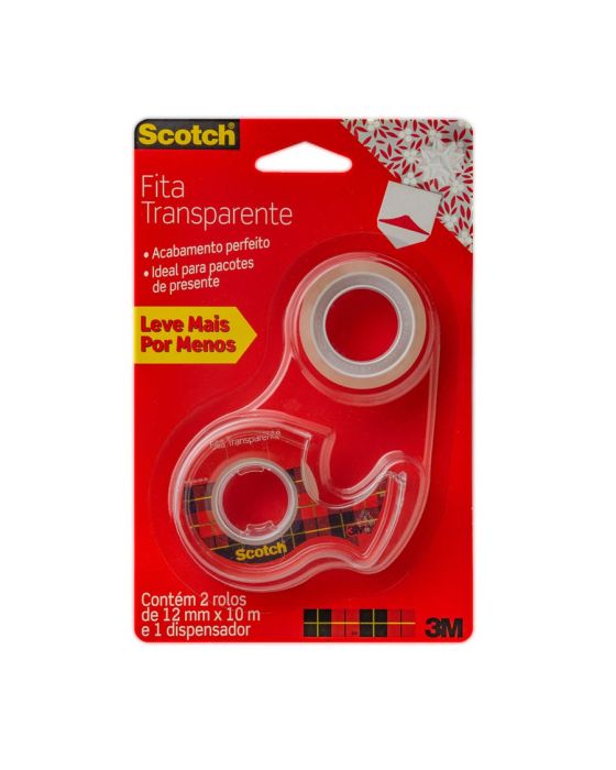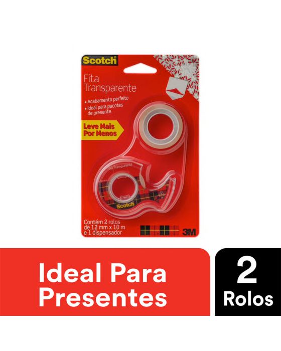 Características:A Fita Adesiva Scotch® Transparente é perfeita para pacotes e presentes que exigem acabamentos finos, pois possui transparência ideal.Detalhes:- Marca: Scotch®;- Fabricante: 3M™;- Modelo: Fita Mágica Scotch®;- Referência: HB004587562;- Linha: Fitas adesivas;- Cor: Transparente;- Contém: 1 blister com 2 rolos do produto e 1 dispensador;- Acompanha: Dispensador;- Corte fácil, desenrolamento suave e sem barulho;- Filme mais espesso, evitando quebras;- Mais fácil de achar a ponta;- Eficiente, a Fita Adesiva Scotch® Transparente cola com maior qualidade e fixa por mais tempo.Aplicação Sugerida:- Perfeita para pacotes e presentes que exijam acabamentos finos, pois é transparente e possui acabamento brilhante.Indicação de Uso:- Ideal para uso escolar e montagem de scrapbook, sendo excelente para colagem de cartazes e materiais leves. É a única do mercado que já vem pronta para uso: sem papel protetor no verso.Benefícios:- É photo safe, não agride papel fotográfico, vem com suporte para fita que facilita o corte e não deixa a ponta se perder e é transparente, garantindo melhor acabamento.Medidas:- Dimensões da fita: 12mm x 10m (1,2cm x 10m). Conteúdo da embalagem: 1 Fita Adesiva Magica 12mm X 10m C/2 Rl + Dispensador Scotch 3m.* As especificações podem ser alteradas sem aviso prévio ** Imagem meramente ilustrativa.