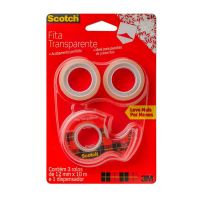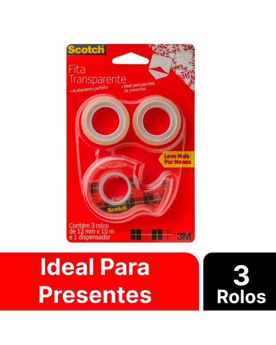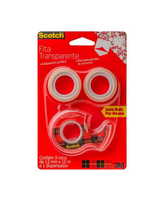 Características:A Fita Adesiva Scotch® Transparente é perfeita para pacotes e presentes que exigem acabamentos finos, pois possui transparência ideal.Detalhes:- Marca: Scotch®;- Fabricante: 3M™;- Modelo: Fita Mágica Scotch®;- Referência: HB004587570;- Linha: Fitas adesivas;- Cor: Transparente;- Contém: 1 blister com 3 rolos do produto e 1 dispensador;- Acompanha: Dispensador;- Corte fácil, desenrolamento suave e sem barulho;- Filme mais espesso, evitando quebras;- Mais fácil de achar a ponta;- Eficiente, a Fita Adesiva Scotch® Transparente cola com maior qualidade e fixa por mais tempo.Aplicação Sugerida:- Perfeita para pacotes e presentes que exijam acabamentos finos, pois é transparente e possui acabamento brilhante.Indicação de Uso:- Ideal para uso escolar e montagem de scrapbook, sendo excelente para colagem de cartazes e materiais leves. É a única do mercado que já vem pronta para uso: sem papel protetor no verso.Benefícios:- É photo safe, não agride papel fotográfico, vem com suporte para fita que facilita o corte e não deixa a ponta se perder e é transparente, garantindo melhor acabamento.Composição:- Composição fita: constituída de um dorso de filme de polipropileno bi-orientado (BOPP) e adesivo acrílico base d’água;- Composição Dispensador: Poliestireno.Medidas:- Dimensões da fita: 12mm x 10m (1,2cm x 10m). Conteúdo da embalagem: 1 Fita Adesiva 12mm X 10m Transparente C/3 Rl + Dispensador Scotch 3m.* As especificações podem ser alteradas sem aviso prévio ** Imagem meramente ilustrativa.
