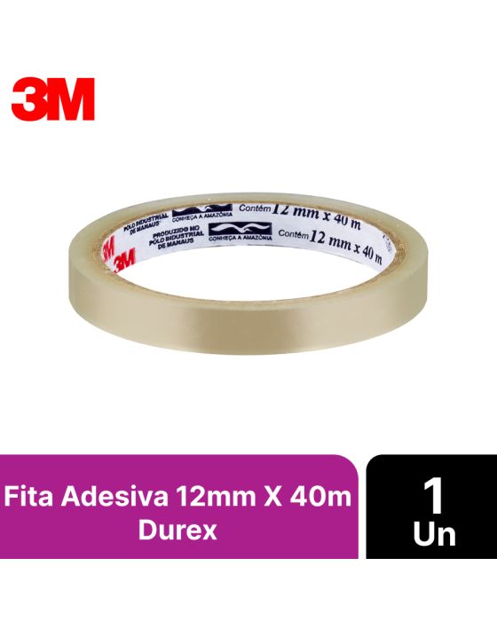 Características:A Fita Adesiva Transparente Durex™ é ideal para quem busca um produto versátil e não abre mão de um trabalho caprichado. Proporciona melhor acabamento, pois é transparente e não aparece nos pacotes.A Fita Adesiva Durex™ Transparente é ideal para quem busca um produto versátil e não abre mão de um trabalho caprichado. Proporciona melhor acabamento, pois é transparente e não aparece nos pacotes. A Fita DurexMR Transparente apresenta melhor acabamento e alta adesão. É mais prática e rápida de colar, com maior adesão instantânea. Pode ser utilizada em trabalhos escolares, colagem em plástico, emendas e reforços de pequenos itens. Ela ainda tem mais resistência à umidade e seu adesivo acrílico deixa a colagem mais rápida. A fita é resistente à umidade e possui desenrolamento leve. Pode ser facilmente cortada com as mãos, sem a necessidade de um aparelho de corte.Detalhes:- Marca: Durex™;- Fabricante: 3M™;- Modelo: Fita Adesiva Transparente Durex™;- Referência: HB004159370;- Linha: Fitas adesivas;- Cor: Transparente;- Contém: 1 unidade do produto;- Tamanho: 12mm x 40m (1,2cm x 40cm (LxC);- Maior adesão instantânea: mais prática e rápida de colar;- Desenrolamento leve;- Pode cortar facilmente com as mãos, sem a necessidade de um aparelho de corte.Aplicação Sugerida:- Proporciona melhor acabamento, pois é transparente e não aparece nos pacotes.Modo de uso:- Recomendamos que a aplicação da fita seja feita em condições próximas de 25 °C e umidade relativa de 50% em ambiente isento de contaminantes e/ou poeira;- Temperaturas muito baixas ou muito altas podem comprometer a performance da aplicação;- Para obtenção da melhor performance, recomendamos que testes prévios sejam feitos a fim de se confirmar todas as variações envolvidas no processo.Medidas:- Dimensões da fita: 12mm x 40cm (1,2cm x 40cm (LxC).Conteúdo da embalagem: 1 Fita Adesiva 12mm X 40m Transparente Durex 3m.* As especificações podem ser alteradas sem aviso prévio ** Imagem meramente ilustrativa.
