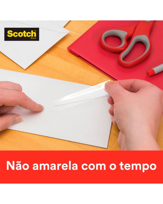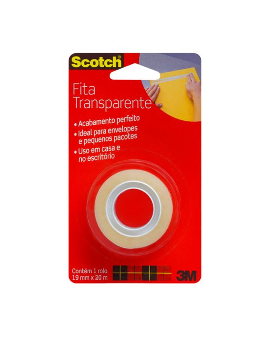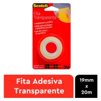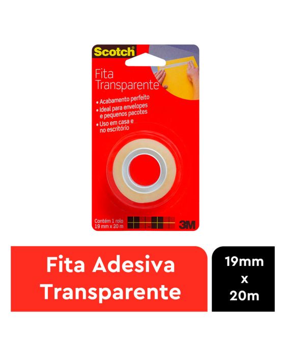 Características:A Fita Adesiva Scotch™ Transparente combina alta clareza com uma aplicação de longa duração. É a clássica fita com acabamento brilhante, sendo especialmente indicada para embrulhos em geral, vedação e reparos. É mais prática e rápida de colar, com maior adesão instantânea além de ser fácil de desenrolar e manusear, garantindo uma colagem forte e permanente. Pode ser facilmente cortada com as mãos, sem a necessidade de um aparelho de corte.Detalhes:- Marca: Scotch™;- Fabricante: 3M™;- Modelo: Fita Adesiva Scotch™ Transparente;- Referência: HB004570634;- Linha: Fitas adesivas;- Cor: Transparente;- Contém: 1 blister com 1 unidade do produto;- Tamanho: 1,9cm x 20m (LxC);- Maior adesão instantânea: mais prática e rápida de colar;- Fácil de desenrolar e manusear;- Garante uma colagem forte e permanente;- Com acabamento brilhante e adesivo de longa duração.Aplicações sugeridas:- Especialmente indicada para embrulhos em geral, vedação e reparos;- Pode ser utilizada em trabalhos escolares, colagens em plástico, emendas e reforços de pequenos itens.Composição:- Composição Dorso: Filme de polipropileno bi-orientado (BOPP)- Composição Adesivo: Acrílico base d’água.Medidas:- Dimensões da fita: 1,9cm x 20m (LxC).Conteúdo: 1 Fita Adesiva 19mm X 20m Transparente C/1 Rl Scotch 3m.* As especificações podem ser alteradas sem aviso prévio ** Imagem meramente ilustrativa.