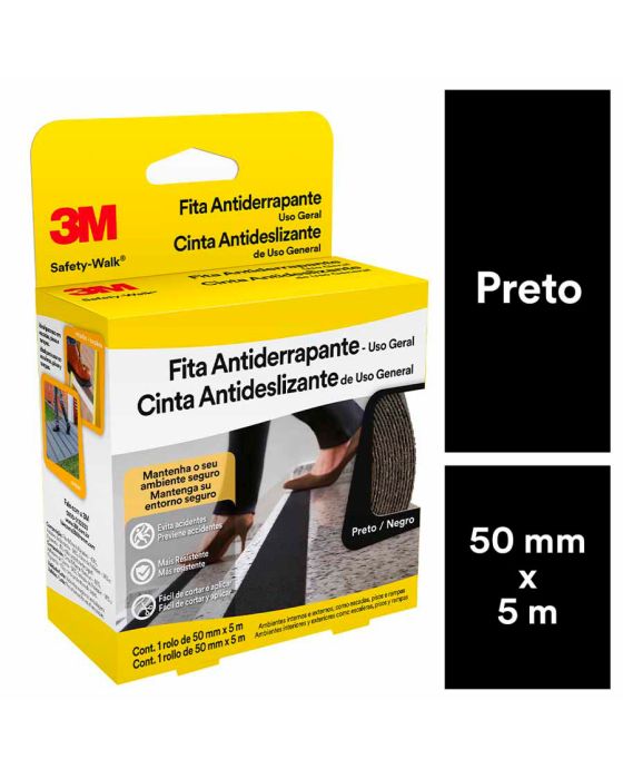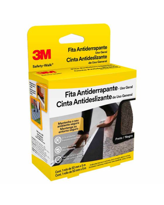 Características:A Fita Antiderrapante 3M™ Safety-Walk® é projetada para reduzir o risco de quedas e acidentes em ambientes residenciais e comerciais. Fácil de aplicar e de cortar com tesoura, seu adesivo é forte e ideal ambientes internos.Esta fita antiderrapante para escadas e pisos é durável, confortável também para pés descalços, resiste a mofo e bolor e não racha ou descasca com o uso. Sua fórmula exclusiva da 3M, menos agressiva ao meio ambiente, garante que a transparência permaneça durante toda a vida útil do produto. É ideal para evitar escorregões e quedas e está disponível em uma variedade de tamanhos, cores e materiais. É um adesivo antiderrapante sensível à pressão de alta fricção fácil de usar e durável, sendo a escolha ideal para sua maior segurança. Pode ser utilizado em escadas, cortadores de grama, mármore, azulejos e pisos de concreto. Detalhes:- Marca: Safety-Walk®;- Fabricante: 3M™;- Modelo: Fita Antiderrapante 3M™ Safety-Walk®;- Referência: H0001912452;- Linha: Fitas Antiderrapantes;- Cor: Preto;- Contém: 1 embalagem com 1 rolo do produto;- Tamanho: 50mm x 5m (5cm x 5m);- Reduz o risco de quedas e acidentes;- Mais Resistente;- Fácil de cortar e aplicar;- Para ambientes internos.Aplicações sugeridas:- Ideal para Escadas, Rampas e Pisos.Modo de usar:- Para utilizar o produto, a superfície deve estar limpa, seca e isenta de gordura. Deverão ser eliminados, antes da aplicação da fita, quaisquer revestimentos que estiverem sobre a superfície, tais como ceras, tintas, vernizes, etc; - Ao aplicar as Fitas Antiderrapantes Safety-Walk, utilize luvas;- Depois de limpar e varrer a superfície, seque-a bem;- A seguir, utilize um solvente como acetona ou álcool (de preferência acetona) para remover resíduos de óleo ou graxa;- Seque bem a superfície, garantindo que todo o solvente foi evaporado. Corte o Safety-Walk no tamanho desejado, arredondando as pontas, a fim de evitar pontos críticos de soltura;- Não aplique sobre emendas de piso (rejuntes) mesmo que este seja de cerâmica;- Respeite as distâncias recomendadas de acordo com cada tipo de aplicação;- Descole apenas a extremidade da fita, e o restante solte gradativamente, removendo o papel protetor do adesivo e aplicando o Safety-Walk na posição desejada. Evite o contato com o adesivo; - Pressione firmemente do centro em direção às extremidades, eliminando eventuais bolhas;- Certifique-se de que as bordas estejam bem aderidas. Para remover a fita, levante uma das extremidades e puxe vagarosamente;- Os resíduos são facilmente removidos com produtos de limpeza.Medidas:- Dimensões da fita: 50mm x 5m (5cm x 5m) (LxC).Conteúdo: 1 Fita Adesiva Antiderrapante 50mm X 5m Safety Walk Preto 3m.* As especificações podem ser alteradas sem aviso prévio ** Imagem meramente ilustrativa.
