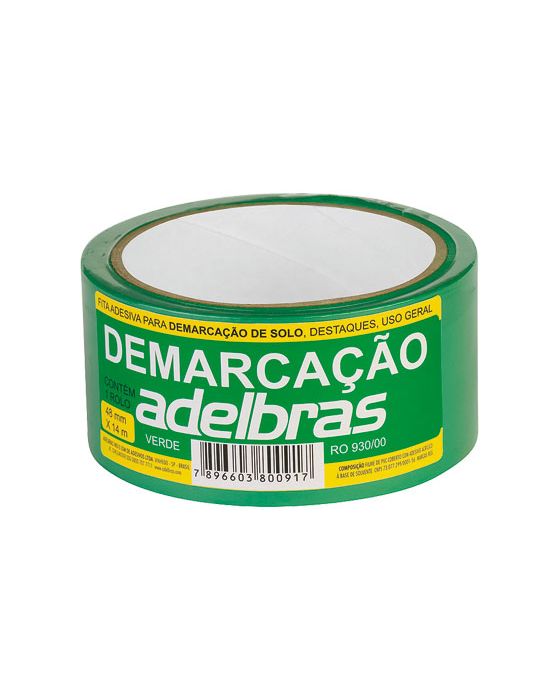 Caracteristicas:- Fita com dorso em PVC e adesivo de borracha e resinas. - Cor verde- 14 metros x 48 mm- Usada para demarcar áreas- Assegure-se que a superfície esteja limpa e livre para a aplicação- Composição: Filme de Policloreto de Vinila (PVC), coberto com adesivo acrilico solvente- Condições de armazenagem: Embalagem original, coberta e protegida do calor, unidade e pó.- Aplicação:Fita destinada para a demarcação de áreas industriais, podendo ter utilização na Fixação em vidros, portas e divisórias, identificação de containers, identificação de extintores e áreas de risco, dentre outras Características Técnicas- Espessura: 0,15 mm - Adesão ao aço: 5,2 N / 25 mm - Resistência à tração: 62,3 N / 25 mm - Alongamento: 160%* As especificações podem ser alteradas sem aviso prévio ** Imagem meramente ilustrativa
