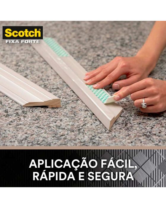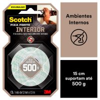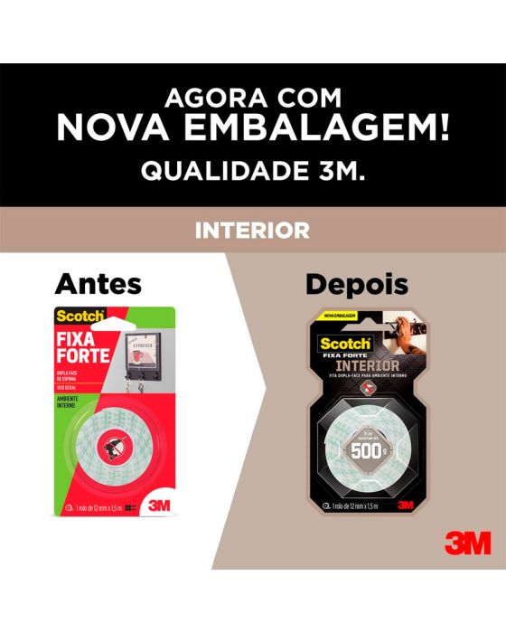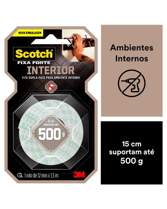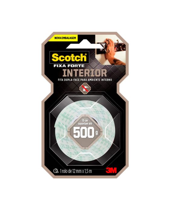 Características:A Fita Dupla Face 3M Scotch® Fixa Forte Interiores (Espuma) é a solução mais prática para fixar canaletas, porta-chaves, quadros, espelhos e peças de decoração, entre outros. Sua aplicação é fácil, evitando furos e sujeira.Detalhes:- Marca: 3M;- Modelo: Fita Dupla Face 3M Scotch® Fixa Forte Interiores;- Referência: HB004750178;- Linha: Fitas dupla face;- Cor: Branca;- Contém: 1 unidade do produto;- Tamanho: 12mm x 1,50m (Largura 9Métrica) x Comprimento);- Excelente fixação: 15 cm suportam até 500g;- Substitui pregos e parafusos;- Para ambientes internos;- Indicados para objetos permanentes;- Não resiste a solventes e à intempéries;- Aplicação fácil, rápida e segura.Aplicações sugeridas:- Canaletas, Porta chaves, Quadros e Espelhos;- Uso interno.Modo de uso:- As superfícies devem estar limpas, secas e livres de gorduras (ceras, óleos etc);- Aplicar uma quantidade de fita especificada na embalagem;- Aplicar a fita numa das superfícies sem esticar, com pressão para garantir o contato e esperar no mínimo 20 minutos;- Remover o liner protetor e aplicar pressionando contra a outra superfície.Peso Suportado:- Cada 15cm de fita suporta 500g.Composição:- Liner: Papel tratado com silicone xadrez;- Núcleo: Espuma de polietileno branca;- Adesivo: Acrílico Sintético à base d’água.Procedimento de Remoção:Este produto é destinado para aplicações permanentes.Medidas:- Dimensões: 12mm x 1,50m (1,2cm x 1,50m).Atenção: A Fita Fixa Forte Espuma é ideal para uso em ambientes interno. Não resiste a solventes e à intempéries.* Não recomendada para uso em papel de parede ou outras superfícies delicadas ou recém pintadas.* As especificações podem ser alteradas sem aviso prévio ** Imagem meramente ilustrativa