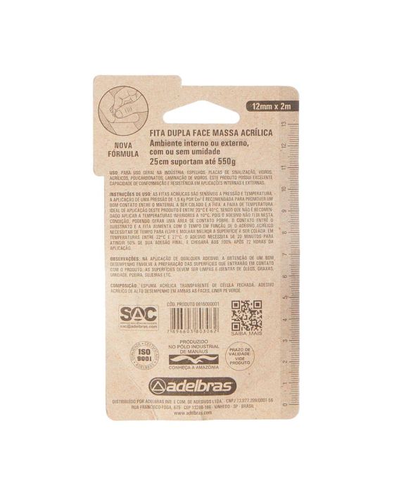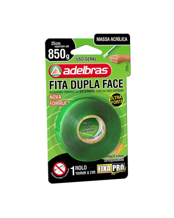 Características:A dupla face massa adesiva possui excelente capacidade de conformação e resistência em aplicações internas e externas. Substitui a utilização de pregos e parafusos em fixações mecânicas. Nossa dupla face massa adesivas fixa pro 200 tem como função o seu uso na indústria, fixação permanente de espelhos, placas de sinalização, vidros, acrílicos, policarbonatos, frisos, acabamentos, bricolagem, artesanato, signs, displays PDV, etc.Detalhes:- Marca: Adelbras;- Modelo: Dupla Face Fixa Forte;- Referência: 0815000017;- Linha: Fitas Adesivas;- Tipo: Dupla Face;- Cor: Transparente;- Contém: 1 unidade do produto;- Vantagens: Conformabilidade, durabilidade, melhor fixação e acabamento. Validade: 60 meses após a data de fabricação.Onde usar:- Utensílios domésticos; acessórios automobilísticos; painéis decorativos; auxílio intermediário nas instalações de telhas em policarbonato e outras aplicações industriais.Composição:- Adesivo de massa acrílica espessura de 0,8mm transparente de alto desempenho, liner PE verde.Armazenamento:- Manter em sua embalagem original, protegida do calor, umidade e pó. Medidas:- Dimensões do produto: 19mm x 2m (1,9cm x 2m);* As especificações podem ser alteradas sem aviso prévio ** Imagem meramente ilustrativa.