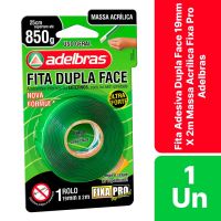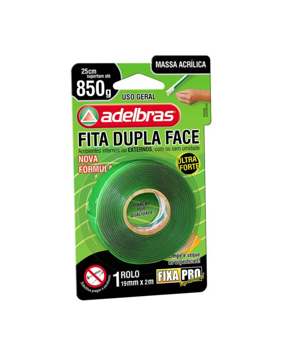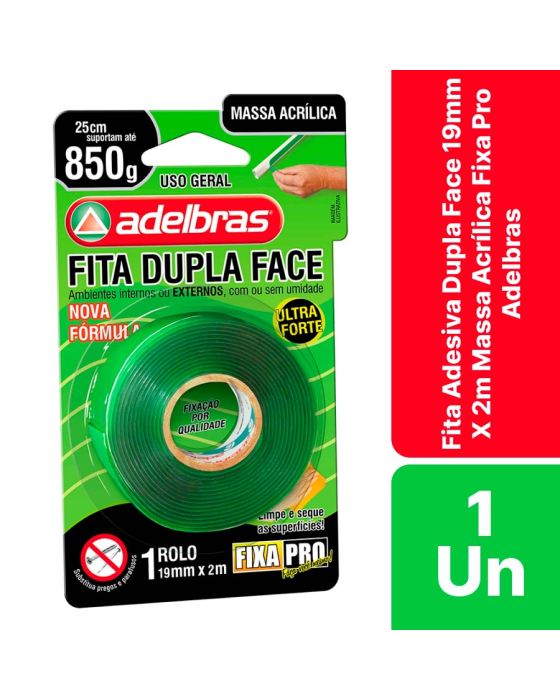 Características:A dupla face massa adesiva possui excelente capacidade de conformação e resistência em aplicações internas e externas. Substitui a utilização de pregos e parafusos em fixações mecânicas. A dupla face massa adesivas fixa pro 200 tem como função o seu uso na indústria, fixação permanente de espelhos, placas de sinalização, vidros, acrílicos, policarbonatos, frisos, acabamentos, bricolagem, artesanato, signs, displays PDV, etc.Detalhes:- Marca: Adelbras;- Modelo: Fixa Pro;- Referência: 0815000031;- Linha: Fita dupla face;- Cores da tinta: Verde;- Suporta: Até 850g a cada 25cm;- Contém: 1 blister com 1 unidade do produto;- Tamanho: 19mm x 2m (1,9cm x 2m);- Excelente capacidade de fixação;- Substitua pregos e parafusos;- Fita ultra forte;- Uso geral.Indústria Brasileira.Uso: - Indicado para uso na indústria, espelhos, placas de sinalização, vidros, acrílicos, policarbonatos, laminação de vidros. Recomendações:- As fitas são sensíveis a pressão e temperatura, não sendo ideal para em temperaturas altas e/ou baixas;- A aplicação de uma pressão de 1,5kg por cm2 é recomendada para promover uma boa adesão;- A faixa de temperatura ideal é entre 20°C e 40°C, não recomendada abaixo de 10°C;- Em temperaturas entre 22°C e 27°C, o adesivo precisa de 20 minutos para atingir 50% de sua adesão final, e chegará aos 100% após 72 horas da aplicação;- Fixação permanente, em caso de remoção pode deixar resíduos.Composição:- Massa adesiva acrílica transparente e liner PE Verde.Medidas:- Dimensões do produto: 6 x 6 x 1,9cm (CxLxA);- Dimensões da embalagem: 15,9 x 9,4 x 2,3cm (CxLxA);- Peso: 160g.* As especificações podem ser alteradas sem aviso prévio ** Imagem meramente ilustrativa.