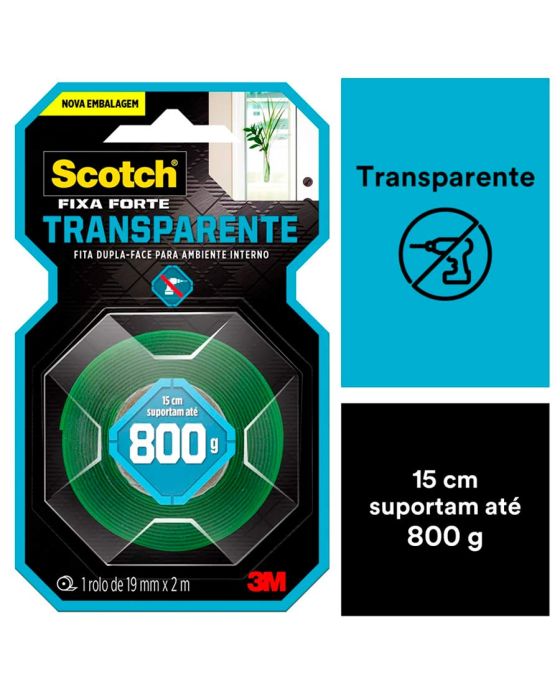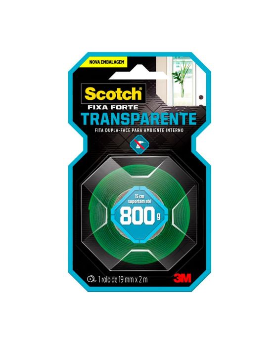 Características:A Fita Dupla Face 3M Scotch® Fixa Forte Transparente é a solução mais prática para fixar quadros, espelhos e peças de decoração. Por ser transparente, é ideal para fixar objetos em superfícies que exibam a fita aplicada, como vidro e acrílico. Sua aplicação é fácil, evitando furos e sujeira.Detalhes:- Marca: 3M;- Modelo: Fita Dupla Face 3M Scotch® Fixa Forte Transparente;- Referência: HB004419881;- Linha: Fitas dupla face;- Cor: Transparente;- Contém: 1 unidade do produto;- Excelente fixação: 15 cm suportam até 800g;- Substitui pregos e parafusos;- Discreta e transparente;- Para ambientes internos;- Aplicação fácil, rápida e segura.Aplicações sugeridas:- Quadros, Espelhos e Objetos de decoração;- Uso iterno, não deve ser exposto ao sol.Modo de uso:- As superfícies devem estar limpas, secas e livres de gorduras (ceras, óleos etc);- Aplicar uma quantidade de fita especificada na embalagem;- Aplicar a fita numa das superfícies sem esticar, com pressão para garantir o contato e esperar no mínimo 20 minutos;- Remover o liner protetor e aplicar pressionando contra a outra superfície.Peso suportado:- Cada 15cm de fita suporta 800g.Medidas:- Dimensões: 2m x 19mm ( 2m x 19mm)(CxL).* Não recomendada para uso em papel de parede ou outras superfícies delicadas ou recém pintadas.* As especificações podem ser alteradas sem aviso prévio ** Imagem meramente ilustrativa