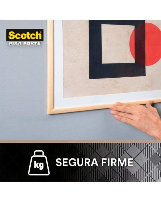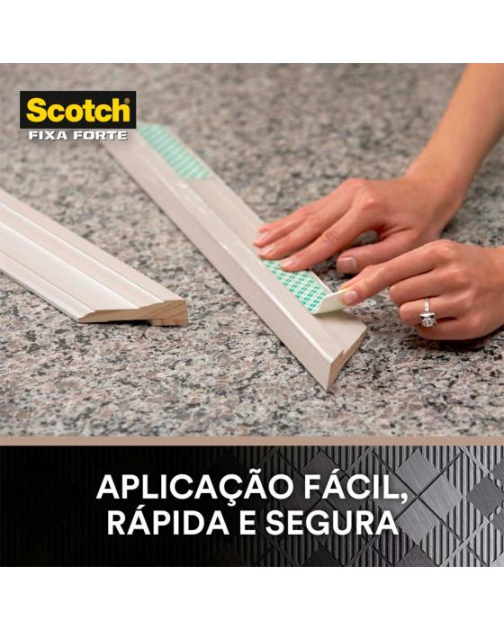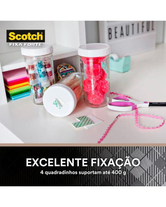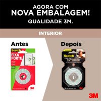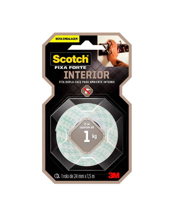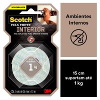 Características:A Fita Dupla Face 3M Scotch® Fixa Forte Interiores (Espuma) é a solução mais prática para fixar canaletas, porta-chaves, quadros, espelhos e peças de decoração, entre outros. Sua aplicação é fácil, evitando furos e sujeira.Detalhes:- Marca: 3M;- Modelo: Fita Dupla Face 3M Scotch® Fixa Forte Interiores;- Referência: HB004750186;- Linha: Fitas dupla face;- Cor: Branca;- Contém: 1 unidade do produto;- Excelente fixação: 15cm suportam até 1kg;- Substitui pregos e parafusos;- Para ambientes internos;- Indicados para objetos permanentes;- Não resiste a solventes e à intempéries;- Aplicação fácil, rápida e segura.Aplicações sugeridas:- Canaletas, Porta chaves, Quadros e Espelhos;- Uso interno.Modo de uso:- As superfícies devem estar limpas, secas e livres de gorduras (ceras, óleos etc);- Aplicar uma quantidade de fita especificada na embalagem;- Aplicar a fita numa das superfícies sem esticar, com pressão para garantir o contato e esperar no mínimo 20 minutos;- Remover o liner protetor e aplicar pressionando contra a outra superfície.Peso Suportado:- Cada 15cm de fita suporta 1kg.Composição:- Liner: Papel tratado com silicone xadrez;- Núcleo: Espuma de polietileno branca;- Adesivo: Acrílico Sintético à base d’água.Medidas:- Dimensões: 1,5cm x 24mm (1,5cm x 2,4cm) (CxL).* Não recomendada para uso em papel de parede ou outras superfícies delicadas ou recém pintadas.* As especificações podem ser alteradas sem aviso prévio ** Imagem meramente ilustrativa