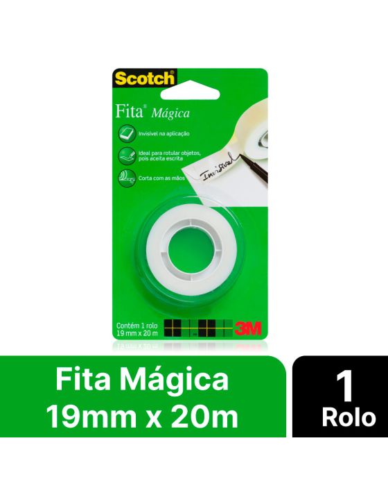 Características:A Fita Mágica Scotch® é ideal para uso em escritórios. Indicada para reparar documentos, identificar objetivos e fazer emendas. Aceita escrita de lápis e caneta e não aparece em fotocópias e scanner. É a melhor opção para uso em escritórios, casas e escolas. Ela não aparece em fotocópias e scanner e nem amarela com o tempo. Conheça todos os benefícios da Fita Mágica Scotch®. É fácil e prática de ser manuseada, pois tem desenrolamento suave e corta facilmente. Com seu acabamento fosco e a tecnologia de adesivo 3M, garante ótima ligação com o papel, podendo ser retirada sem deixar rastros.Detalhes:- Marca: Scotch®;- Fabricante: 3M™;- Modelo: Fita Mágica Scotch®;- Referência: HB004544811;- Linha: Fitas adesivas;- Cor: Transparente;- Contém: 1 blister com 1 rolo do produto;- Não aparece em fotocópias nem scanner;- É fácil e prática de manusear, tem desenrolamento suave e corta facilmente;- Aceita escrita de lápis e caneta e não amarela com o tempo;- É fácil e prática de ser manuseada, pois tem desenrolamento suave e corta facilmente.Aplicação Sugerida:- Ideal para reparar documentos, identificar objetos, fazer emendas de rasgos do papel e até tirar decalques de chassis.Benefícios:- Desaparece na maioria dos documentos e scanners, facilitando a leitura , repara, fixa de forma segura e discreta, fácil de manusear e cortar com as mãos.Medidas:- Dimensões da fita: 19mm x 20m (1,9cm x 20m).Conteúdo da embalagem: 1 Fita Adesiva Magica 19mm X 20m C/1 Rl Scotch 3m.* As especificações podem ser alteradas sem aviso prévio ** Imagem meramente ilustrativa.