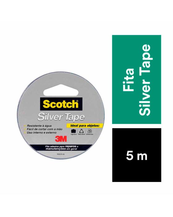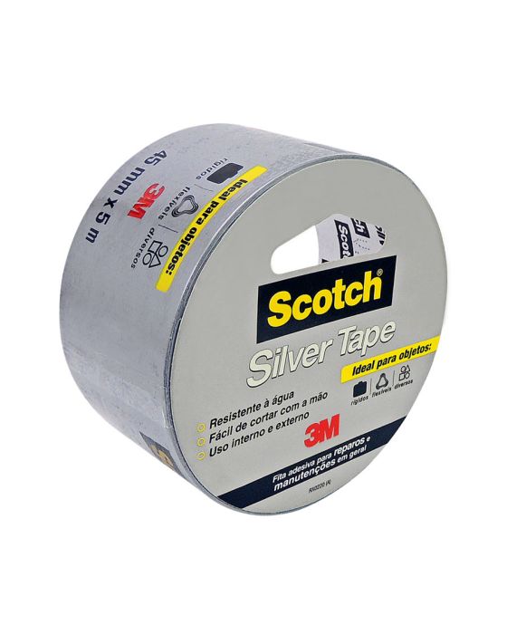 Características:A Fita Silver Tape 3M Scotch™ é ideal para reparos provisórios, fixações diversas e manutenções de forma rápida, Possui alta adesão e é resistente à água e é mais resistente à ruptura. Esta fita é adequada para reparos e manutenção em geral.Detalhes:- Marca: Scotch®;- Referência: HB004557912;- Linha: Fita Adesiva Silver Tape;- Cor: Cinza;- Contém: 1 unidade do produto;- Tamanho: 45cm x 5m;- Resistente à água;- Fácil de cortar com a mão;- Uso interno e externo.Aplicações sugeridas:- Ideal para objetos tanto rígidos quanto flexíveis;- Vedação de dutos de ar condicionado e refrigeração;- Trabalhos de manutenção em geral;- Reparos provisórios em materiais náuticos (botes, pranchas, etc);- Enfeixamento, embalagem,empacotamento, vedação provisoria em tubulações não aquecidas, encadernação, etc.Modo de usar:- Pronta para uso.Propriedades físicas:- Adesão a placa de aço : 1000 gf/19 mm delargura;- Resistência à tração : 7,4 kgf/19 mm de largura;- Alongamento na ruptura : 11,0 %;- Espessura total : 0,25 mm.Composição:- Material da Base (Suporte): Polipropileno.Medidas:- Dimensões da embalagem: 4,6 x 9,1 x 9,1cm (AxLxC);- Peso: 79g.* As especificações podem ser alteradas sem aviso prévio ** Imagem meramente ilustrativa.