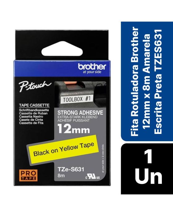 Caracteristicas:- Rotulagem profissional com alta resistência e visibilidade aprimorada: A Fita Rotuladora Brother TZe-S631 12mm x 8m Amarela com Escrita Preta foi desenvolvida para atender às necessidades de identificação técnica, organizacional e industrial com alta durabilidade e legibilidade. Sua tecnologia de laminação exclusiva Brother assegura excelente desempenho mesmo em ambientes adversos, oferecendo resistência superior a calor, frio, umidade, produtos químicos, abrasão, luz solar e poeira. A cor amarela de fundo garante máxima visibilidade da escrita preta, ideal para aplicações que exigem destaque e leitura imediata.- Etiqueta laminada com tecnologia avançada e adesivo de alto desempenho: Com largura de 12 mm e comprimento de 8 metros, a fita TZe-S631 utiliza laminação multicamada que protege a impressão contra desgaste e desbotamento, prolongando sua vida útil em aplicações internas e externas. O adesivo supercola garante fixação firme em superfícies lisas, irregulares, texturizadas ou com presença de poeira e oleosidade, evitando o descolamento mesmo em condições extremas de uso. Essa formulação técnica confere aderência estável e confiável, essencial para ambientes industriais, laboratoriais e corporativos.- Desempenho confiável em temperaturas extremas e condições severas: Projetada para resistir a variações térmicas de -80°C a +150°C, a fita Brother TZe-S631 mantém suas propriedades adesivas e legibilidade em ambientes frigorificados, áreas expostas ao calor, setores automotivos e instalações técnicas. Além disso, apresenta resistência comprovada à água, luz solar direta, produtos químicos e abrasão, o que a torna ideal para uso profissional em facilities, manutenção predial, elétrica, telecomunicações e manufatura.- Compatibilidade ampla e aplicação precisa: Compatível com diversos modelos de rotuladoras Brother P-touch, como PTH110, PTD210, PTP300BT, PTH110BK, PTE300VP, PTE110, PTE500VP, PTE550WVP, PTP700, PTP750W, PTP900W e PTP950NW, o cartucho TZe-S631 é fácil de instalar e oferece alimentação precisa, garantindo impressões nítidas e alinhadas. Essa compatibilidade torna o modelo versátil e ideal para equipes que utilizam diferentes equipamentos de identificação dentro da mesma operação.- Qualidade e confiabilidade Brother: A Brother é uma marca global reconhecida por sua inovação em soluções de impressão, confiabilidade técnica e compromisso com o desempenho profissional.- Composição: Filme laminado multicamada de poliéster (PET), camada adesiva acrílica de alta performance, tinta pigmentada preta, revestimento protetor, liner siliconado e cartucho de polímero técnico reciclável.- Dimensões da embalagem: Comprimento: 11,5cm; Largura: 7cm; Altura: 1,8cm; Peso: 55g. * As especificações podem ser alteradas sem aviso prévio ** Imagem meramente ilustrativa.