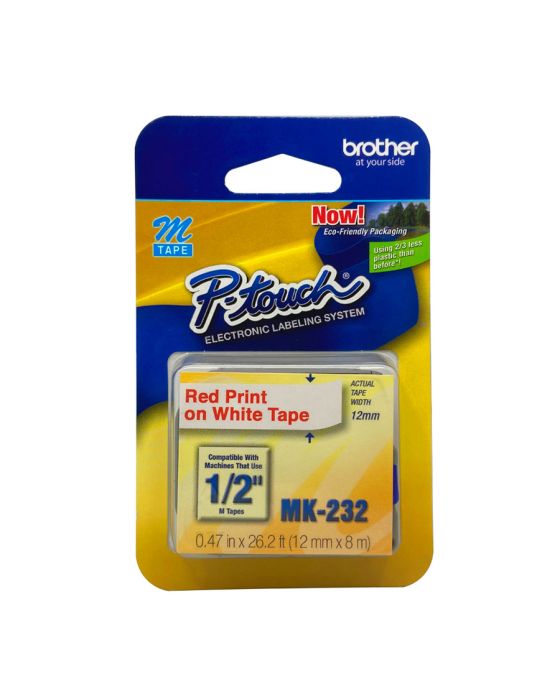 Características:As fitas adesivas da Brother contam com forte adesivo de fixação e podem ser usadas para etiquetar utensílios domésticos, pastas, documentos, materiais escolares e o que mais você desejar. Detalhes:- Marca: Brother.- Modelo: MK232.- Linha: Fita Rotuladora.- Cor da fita: Branca.- Cor da escrita: Vermelha.- Contém: 1 unidade do produto.- Forte fixação.- Durável.- Atóxica.- Compatível com os modelos: PT70, PT80 e PT90.Indicada para:- A MK232 são ideais para identificar utensílios de cozinha, objetos pessoais, materiais escolares e de escritório, pastas, documentos e o que mais você desejar.Recomendação:- Pode utilizar as etiquetas em ambientes internos, seja em casa ou no escritório, em superfícies secas e planas.Medidas:- Largura: 12mm (1,2cm).- Comprimento: 8m.* As especificações podem ser alteradas sem aviso prévio ** Imagem meramente ilustrativa