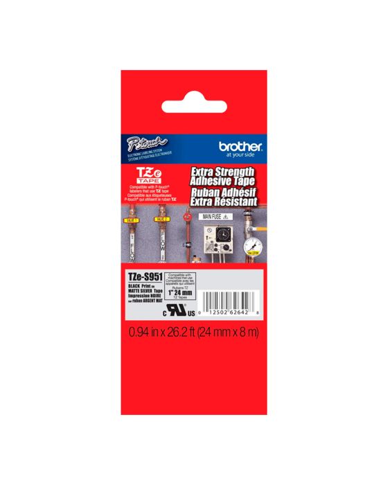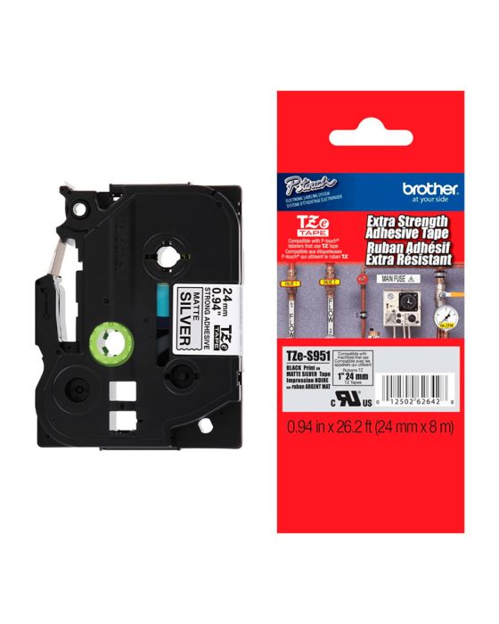 Características:As fitas Brother TZES951 é indicado para identificação de patrimônio, superfícies irregulares e com textura áspera e locais de metal e plástico, conta com tecnologia única de laminação o que torna essa fita resistente e durável, e pode ser usada em ambiente externo e interno, permitindo que você crie etiquetas para diversos tipos de aplicação, seja para uso doméstico ou profissional em diversas áreas como educação, saúde, escritórios e hotéis!A linha TZE possui etiquetas laminadas, resistentes a temperaturas extremas, resistentes à água, abrasão e a produtos químicos, além de não desbotarem e possuírem uma película de proteção fácil de destacar.Detalhes:- Marca: Brother;- Modelo: TZES951;- Linha: Fitas Rotuladoras;- Família: Linha TZE;- Cor da fita: Prata;- Cor da escrita: Preto;- Acabamento: Fosco;- Tamanho: 24mm;- Contém: 1 unidade do produto;- Fita laminada com super cola;- Não desbota;- Possui alta aderência;- Durável;- Atóxica.Indicada para:- A TZES951 é indicada para identificação de patrimônios. Também é recomenda para ambientes com grande chance de acúmulo de poeira ou oleosidade, além de locais úmidos, quentes, frios e com fatores químicos.Compatibilidade:- Compatível com os modelos de rotuladores: PTE500VP, PTE550WVP, PTP700, PTP750W, PTP900W e PTP950NW.Resistência:- Temperaturas extremas (-80°C até +150°C);- A água, sol, umidade, substâncias químicas, abrasão, e poeira.Tipo de fita:- Laminada, com super cola e ecológica.Medidas:- Largura: 24mm (2,4cm);- Comprimento: 8m.* As especificações podem ser alteradas sem aviso prévio ** Imagem meramente ilustrativa.
