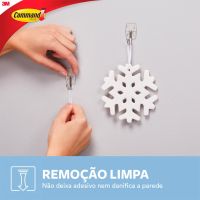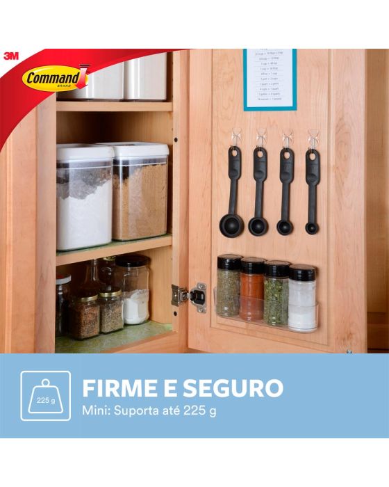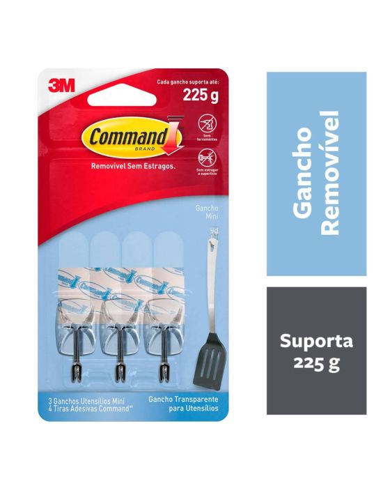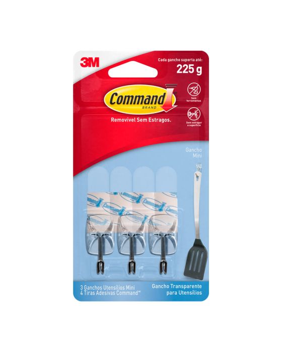 Caracteristicas:O Gancho Adesivo para Utensílios 3M™ Command® é a solução ideal para organizar sua cozinha e área de serviço do seu jeito, de forma prática, sem sujeira e sem furos na parede. Faça você mesmo em minutos e remova quando quiser, sem estragar sua parede.Sem deixar resíduos e sujeira, o Gancho 3M™ Command™ Utensílios Transparente pode ser aplicado em várias superfícies, assim como em áreas mais úmidas da casa. Versátil e discreto, é ideal para quem quer deixar à mostra apenas o que mais importa: sua decoração.Esqueça os pregos, parafusos ou tachas. O Gancho 3M™ Command™ Utensílios Transparente é muito mais fácil e rápido de pendurar! Ele possui adesão firme em muitas superfícies, como pinturas, madeiras, azulejos e muitas outras. Além disso, pode ser removido sem deixar furos, marcas ou resíduos. Está no tamanho certo para que você mostre apenas o que mais importa: a sua decoração e não como ela foi colocada no lugar.Detalhes:- Marca: Command®;- Fabricante: 3M;- Modelo: Gancho Adesivo para Utensílios 3M™ Command™;- Referência: HB004270532- Linha: Prendedores;- Cor: Transparente;- Contém: 1 embalagem com 3 unidades do produto;- Firme e seguro: cada gancho suporta até 225 g;- Sem ferramentas: fácil de aplicar e remover;- Remoção limpa: não deixa adesivo nem danifica a parede.Como usar:- Para aplicar estes ganchos de parede, limpe a parede com álcool e um pano seco. Não use produtos de limpeza, aerossóis ou toalhinhas de limpeza, pois elas deixam um resíduo escorregadio que impede a aderência.;- Separe as tiras e remova o recobrimento preto. Depois, pressione a tira diretamente sobre a parede que você quer colocar o seu gancho e pressione ao longo de toda a tira durante 30 segundos;- Remova o recobrimento azul e pressione firmemente durante 30 segundos. Lembre-se que quanto maior a pressão, mais forte será a aderência. Espere por uma hora antes de pendurar qualquer coisa no gancho; dessa maneira, a união adesiva atingirá sua máxima resistência;- Para remover, segure o gancho suavemente com seus dedos sem pressionar. Lembre-se que você não deve puxar as tiras para você, pois isso danificaria a parede. Faça-o sempre para baixo, o mais devagar possível;- Pressione com o polegar a tira grudada na parede e com a outra mão puxe lentamente para baixo esticando-a até atingir os 30 centímetros ou até que a tira desgrude da parede.Aplicações sugeridas- É indicado para decoração fácil e rápida sem causar danos na parede.Material- Composição do produto: Gancho: polietileno e aço inoxidável;- Tira adesiva: fita de polietileno com adesivo à base de borracha;Medidas:- - Dimensões da base (AxLxP): 2,7 x 2 x 0,3cm;- Dimensões com gancho (AxLxP): 4 x 2x x 1,5cm;- Validade: 2 anos. Conteúdo da embalagem: Três ganchos transparentes e quatro adesivos transparentes Command.ATENÇÃO! NÃO PENDURE QUADROS EM GANCHOS.* As especificações podem ser alteradas sem aviso prévio ** Imagem meramente ilustrativa.