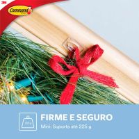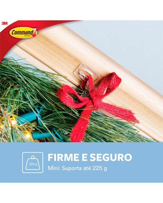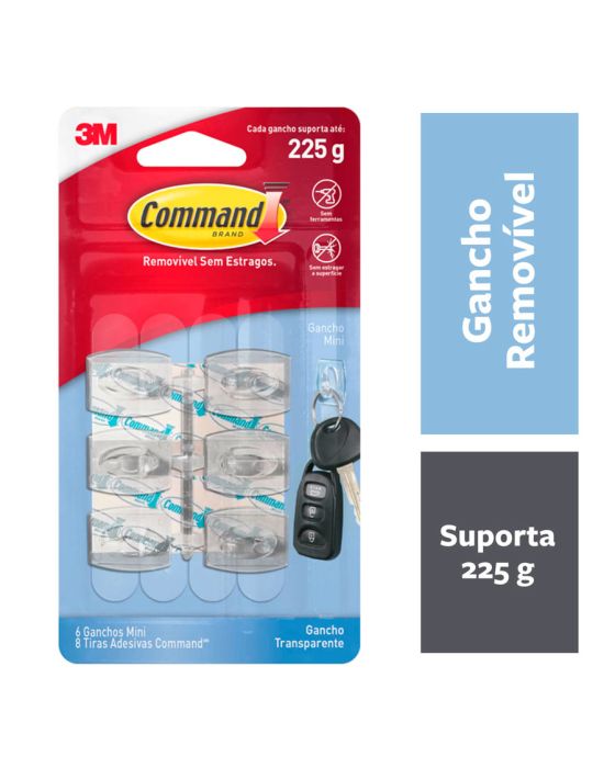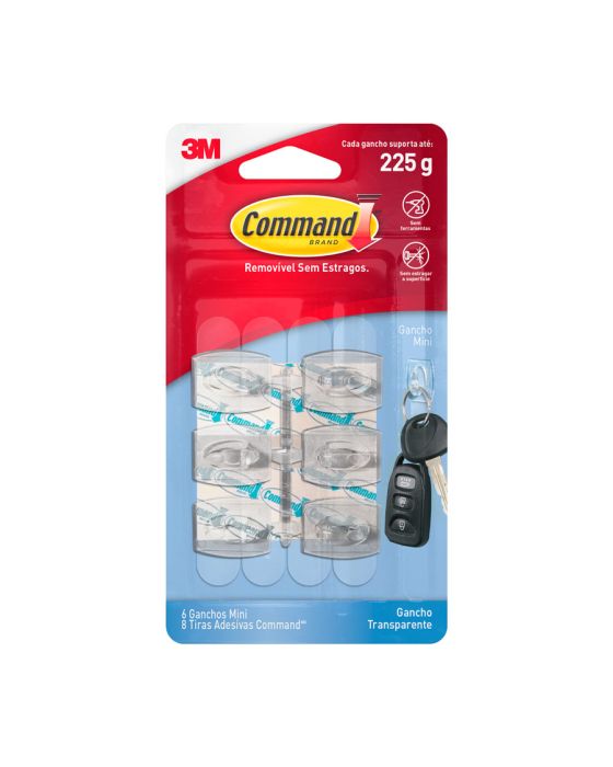 Características:Aplicação forte, remoção limpa, resultados sem danos na parede. Sem deixar resíduos e sujeira, o Mini Gancho Adesivo 3M™ Command™ Transparente pode ser aplicado em várias superfícies. Versátil e discreto, é ideal para quem quer deixar à mostra apenas o que mais importa: sua decoração. Cada embalagem contém seis mini ganchos transparentes com oito adesivos pequenos, sendo que cada gancho suporta até 225g. O Gancho Adesivo 3M™ Command™ está disponível em vários desenhos para combinar com sua decoração e seu estilo. Também pode ser encontrado em diversos tamanhos, segurando uma quantidade surpreendente de peso – dependendo do modelo, até sete quilos e meio! Esqueça os pregos, parafusos e tachas: esses ganchos adesivos 3M™ são rápidos e fáceis de pendurar, podem ser utilizados em diversas superfícies e são removidos de forma limpa sempre que você desejar.Detalhes:- Marca: Command™;- Fabricante: 3M™;- Referência: HB004270490;- Linha: Ganchos Adesivos;- Cor: Transparente;- Tamanho: Mini;- Contém: 6 Ganchos Mini e 8 Tiras Adesivas;- Suporta até: Cada gancho suporta até 225kg;- Sem ferramentas, Fácil de aplicar e remover;- Com a tecnologia do adesivo Command é possível trocar os ganchos de lugar sem danificar as paredes.- Firme e seguro.Indicado para:- É indicado para decoração fácil e rápida sem causar danos na parede.Modo de uso:- Como usar: Para aplicar estes ganchos de parede, limpe a parede com álcool e um pano seco;- Não use produtos de limpeza, aerossóis ou toalhinhas de limpeza, pois elas deixam um resíduo escorregadio que impede a aderência;- Separe as tiras e remova o recobrimento do adesivo;- Pressione a tira sobre a parte posterior do gancho;- Agora, pressione o gancho firmemente contra a parede ou superfície durante mais ou menos 30 segundos;- Quanto maior for a pressão, mais forte será a adesão;- Para que realmente exista uma aderência, você tem que deslizar o gancho para cima, fora da base de montagem;- Espere 1 hora antes de pendurar algum artigo;- Para remover, empurre para cima a parte inferior do gancho para deixar a base à vista na parede;- Segure a base com cuidado, não a pressione contra a parede;- Lembre-se de que você nunca deve puxar a tira em sua direção, sempre puxe para baixo o mais devagar que você puder;- Pressione com o polegar a tira grudada na parede e com a outra mão puxe lentamente para baixo mantendo-a esticada aproximadamente 30 cm ou até que esta desgrude da superfície.Composição:- Liner: Papel;- Gancho: Poliestireno de alto impacto;- Filme: Fita de Polietileno;- Adesivo: Borracha.Recomendação:- Apesar de seu alto poder de adesão à maioria das superfícies lisas e de ser fabricado sob rigoroso controle de qualidade, o adesivo Command pode não aderir a algumas superfícies. Por este motivo não recomendamos sua utlização com objetos valiosos ou insubstituíveis;- Para sua total segurança não utilize os produtos Command para fixação de objetos sobre cabeceiras de camas;- Não aplique os produtos Command sobre papel de parede, pois, pode não aderir em alguns papéis de parede de vinil;- A utilização de dois ou mais ganchos simultaneamente não garante a sustentação da soma do peso máximo especificado na cartela;- Não aplique em superfícies expostas diretamente à luz solar;- Não aplique sobre tinta fresca;- Não aplique em superfícies irregulares, muito texturizadas ou que absorvam umidade.Conteúdo da embalagem: 6 Ganchos Mini Command™ e 8 tiras adesivas.* As especificações podem ser alteradas sem aviso prévio ** Imagem meramente ilustrativa.