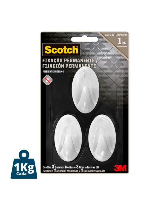 Características:- Ganchos adesivos com fixação permanente para organização interna: O Gancho Scotch Médio Branco 3M foi desenvolvido para oferecer uma solução prática e permanente de fixação em ambientes internos. Seu formato compacto e construção em poliestireno garantem boa resistência estrutural, enquanto o adesivo à base de borracha sintética assegura aderência eficiente em superfícies lisas, sem necessidade de ferramentas, pregos ou parafusos.- Instalação simples com suporte de até 1 kg por gancho: Cada gancho suporta até 1 kg, permitindo organizar objetos leves como utensílios, acessórios, chaves, pequenas bolsas e itens de uso cotidiano. A instalação é direta: basta remover o liner protetor, aplicar sobre a superfície limpa e aguardar a cura do adesivo. O conjunto inclui três ganchos médios nas dimensões 5 × 3,5 × 3 cm (AxLxP), adequados para uso em paredes, portas, móveis e áreas internas diversas.- Design moderno em cor branca para integração discreta: Com visual limpo e acabamento branco, os ganchos combinam com diferentes estilos de decoração, oferecendo organização sem interferir no ambiente. O design é projetado para ocupar pouco espaço, garantindo funcionalidade com estética discreta.-Aplicações em residências, escritórios e áreas de uso diário: Os ganchos são indicados para organização doméstica, ambientes corporativos, cozinhas, closets, lavanderias e outras áreas onde seja necessário pendurar itens de maneira permanente. São ideais para quem busca otimizar espaços sem causar danos estruturais às superfícies.- Sobre a marca 3M: A 3M é referência mundial em soluções adesivas, organização e produtos técnicos para uso profissional e doméstico.- Dimensões da embalagem:Comprimento: 17,5cm; Largura: 11cm; Altura: 2,5cm; Peso: 30g.* As especificações podem ser alteradas sem aviso prévio ** Imagem meramente ilustrativa.