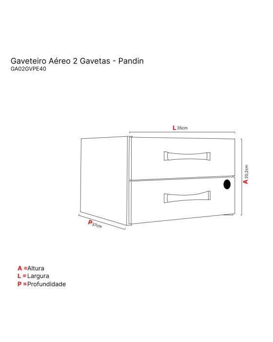 Características:A linha PE40 Pandin é ideal para desempenhar tarefas diárias de trabalho armazenando pastas suspensas tamanho oficio, ele oferece espaço para você e deixa o seu local de trabalho muito mais organizado e elegante.Detalhes:- Marca: Pandin.- Modelo: GA02GVPE40TUB.- Linha: Gaveteiro Aéreo.- Cor: Walnut/Preto.- Gavetas: 2 Gavetas.- Material: MDP 15mm.- Fechadura: Tipo Yale, com duas chaves e fechamento simultâneo das gavetas.- Puxador externo em Polietileno.- Sistema de deslizamento por trilhos com roldana de nylon.Onde usar:- Escritórios: Organização de materiais de escritório, livros, pastas e documentos.- Home Office: Organização de livros, pastas e documentos.Medidas:- Largura: 35cm.- Altura: 20,2cm.- Profundidade: 37cm.- Peso: 4kg.Acabamento- Acabamento em fita em PVC (Poliestireno) com 0,45mm espessura com bordas aparentes encabeçadas.Capacidade - Capacidade de peso: Suporta até 15kg por gaveta.Instruções de limpeza:- Passar um pano levemente umedecido com água e/ou detergente neutro e em seguida um oano seco para as limpezas do dia a dia.*Produto enviado desmontado.Manual em vídeo para montagem: https://www.youtube.com/watch?v=qL4a6pBvHiw* As especificações podem ser alteradas sem aviso prévio ** Imagem meramente ilustrativa.