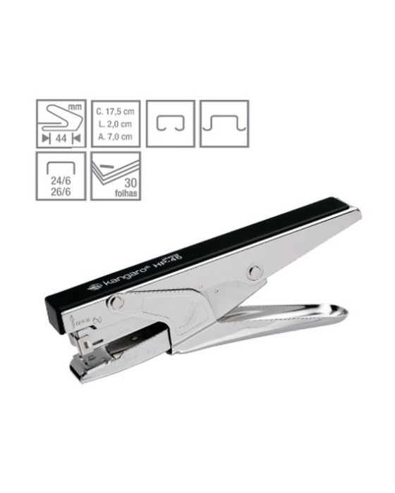 Caracteristicas:- Grampeador alicate- Grampos 24/6 e 26/6- Corpo todo metálico- Grampeia até 30 folhas- Armazena até 100 grampos- 2 posições para fixação- Medidas: C:17,5 x L:2 x A:7cm* As especificações podem ser alteradas sem aviso prévio ** Imagem meramente ilustrativa