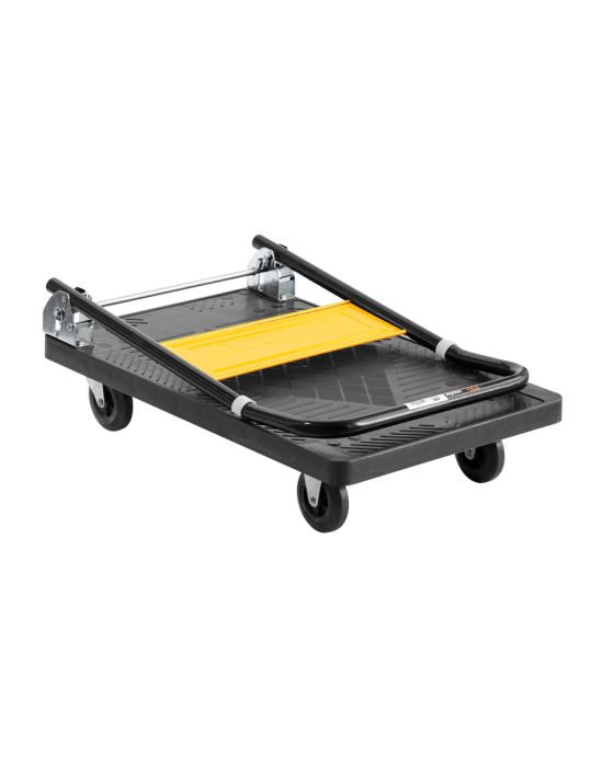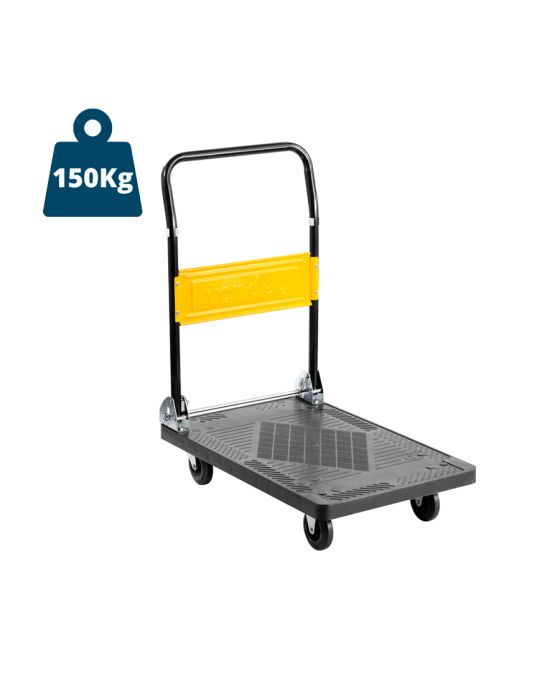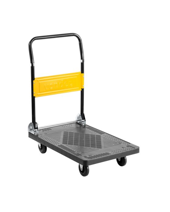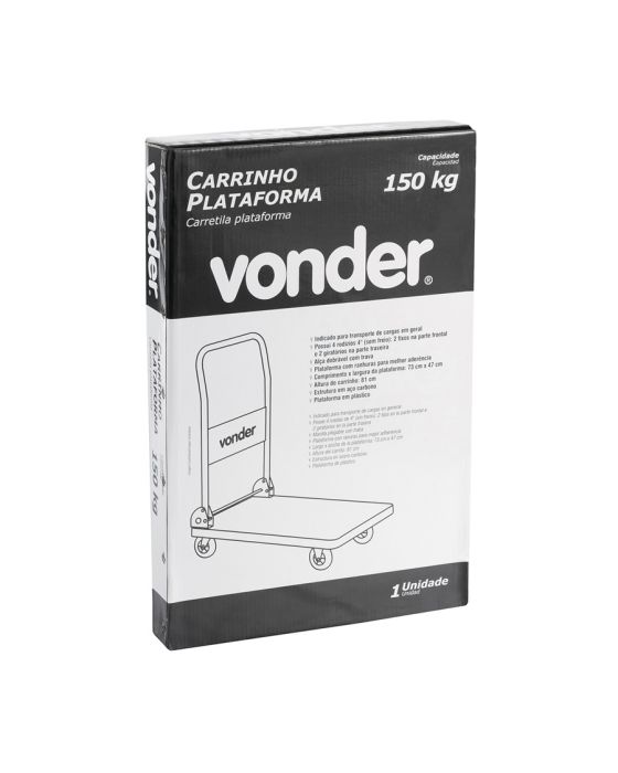 Características:O Carrinho Plataforma Vonder é a solução ideal para quem busca praticidade e eficiência no transporte de cargas em centros de distribuição, supermercados, estoques e demais ambientes logísticos. Com capacidade para até 150kg, sua estrutura robusta, fabricada em aço carbono, oferece resistência, enquanto a plataforma em plástico com ranhuras proporciona maior aderência e estabilidade para as cargas.Este carrinho conta com alça dobrável e com trava, o que facilita o transporte e o armazenamento. Além disso, é equipado com 4 rodízios (2 fixos na parte frontal e 2 giratórios na parte traseira) que garantem fácil manuseio, mesmo em espaços mais apertados.Detalhes:- Marca: Vonder;- Referência: 61.60.000.015;- Linha: Carrinho plataforma;- Tipo: Dobrável;- Cor: Preto com detalhes em amarelo;- Capacidade: 150kg;- Contém: 1 unidade do produto;- Tipo de roda: Rodízio;- Tamanho da roda: 4;- Possui 4 rodízios, sendo: 2 fixos na parte frontal e 2 giratórios na parte traseira, ambos sem freio;- Possui alça dobrável com trava e plataforma com ranhuras para melhor aderência.Fabricado na China. | Validade: Indeterminada.Ideal para: - Ideal para transporte de cargas até 150kg em centros de distribuições, supermercados, lojas, estoques em gerais e demais áreas logísticas.Recomendações:- Utilize EPI.Composição:- Estrutura fabricada em aço carbono e plataforma fabricado em plástico com ranhuras.Medidas:- Dimensões do produto montado: 73 x 47 x 81cm (CxLxA);- Dimensões da base: 73 x 47cm (CxL);- Dimensões da embalagem: 71,7 x 47,3 x 13cm (CxLxA);- Peso: 8,65kg.Conteúdo da embalagem: 1 Carrinho plataforma.Garantia do fornecedor: 3 meses contra defeitos de fabricação.* As especificações podem ser alteradas sem aviso prévio ** Imagem meramente ilustrativa.