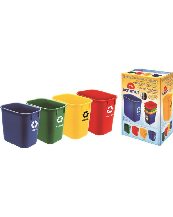 Características:- Fabricado em polipropileno, tem alta resistência e grande durabilidade- Gravado com o símbolo de ´reciclável´ e com a indicação do material a ser reciclado- Medida Aproximada: 28,5 x 23,5 x 13 cm - Kit com 4 cestos para coleta seletiva: Papel, Plástico, Metal e Vidro- Capacidade: 12 Litros cada- Medida Aproximada: 28,5 x 23,5 x 13 cmNa Contabilista você também encontra os Sacos de Lixo Próprios para esse produto, tanto na cor preta, quantos coloridos(para caso de coleta seletiva).* As especificações podem ser alteradas sem aviso prévio ** Imagem meramente ilustrativa.