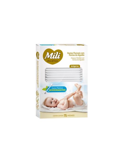 Caracteríticas:Higiene com maciez e segurança para pequenos ouvidos.Produzidos para a higiene perfeita da família, as hastes Mili são flexíveis e inquebráveis.Possuem antigermes e se destacam pela maciez do algodão, que não se desprende e não solta fiapos. - Hastes Flexíveis Mili - 1 Caixa com 75 hastes - Embalagem em papel para proteger o produto. Cuidados: Evite introduzir a haste no canal do ouvido. Mantenha fora do alcance de crianças. Com o surgimento de problemas por uso inadequado, procure um médico. Conservação: Mantenha a embalagem bem fechada e em local seco e fresco* As especificações podem ser alteradas sem aviso prévio ** Imagem meramente ilustrativa