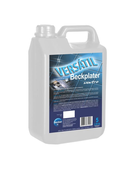 CaracterísticasPoderoso detergente e desengordurante, permitindo altas diluições, o que aumenta consideravelmente seu rendimento e a sua consequente economia na lavagem. Produto contém tensoativo biodegradável.- Conteúdo: 5L- Fragrância: NeutroEspecificações- Físicas - Aspecto: Líquido viscoso - Cor: Amarelo, branco, vermelho, verde - pH: 6,5 - 7,5 - Viscosidade: mínimo 240 cPs- Composição: Blend de lauril eter sulfato de sódio/alquil poliglicosideo/coco amido propil betaina/ alquil benzeno sulfonato de sódio, lauril éter sulfato de sódio, espessante, conservante, corante e veículo.- Campo de aplicação: Produto de grande versatilidade e economia, sendo indicado para cozinhas profissionais, frigoríficos, indústrias alimentícias, salas de preparação, limpeza de pisos e paredes em hospitais, shoppings e supermercados.- Finalidade: Limpeza em geral.Modo de uso: Na esponja: Aplicar uma pequena quantidade de VERSÁTIL BECKPLATER sobre uma esponja umedecida e esfregue sobre a superfície a ser limpa. Enxágue em seguida. Pode ser usado em máquina de lavar pratos numa diluição de 1:50. Para limpezas em geral pode ser diluído em até 1:30.Para consultar a FDS (Ficha com Dados de Segurança), acesse (copiar e colar no navegador):https://preview--consultafdscontabilista.base44.app/share?product_id=74713* As especificações podem ser alteradas sem aviso prévio** Imagem meramente ilustrativa