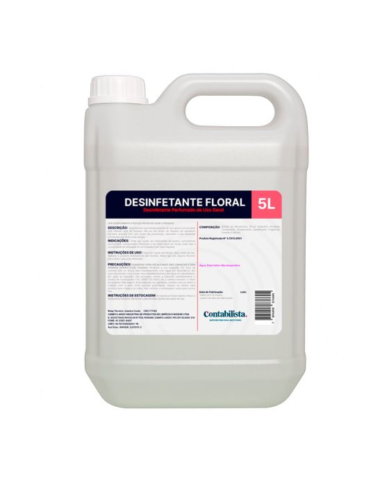 Caracteristicas:Desinfetante Floral Contabilista é um produto com eficiente ação de limpeza.Alia ao seu poder de limpeza um agradável perfume floral com alto poder de penetração, deixando o ambiente perfumado por muito mais tempo.Possui formulação balanceada, não mancha os sanitários ne os danifica.APLICAÇÃO:Pode ser utilizado em instituições de ensino, consultórios, lanchonetes, restaurantes, indústrias e de modo geral em locais onde haja a necessidade de utilização de um limpador com ação de limpeza.INSTRUÇÕES DE USOPuro em vasos sanitários, ralos, latas de lixo aplique o produto diretamente nas bordas, deixe agir por alguns minutos para obter uma ação eficiente.Diluído na limpeza, aplicar em pisos, banheiros, azulejos esmaltados e mármores.INSTRUÇÕES DE ESTOCAGEMArmazenar em local coberto e fresco à temperatura ambiente. Mantenha o galão fechado quando não estiver em uso.Contém: 5lFragrência: FloralProduto notificado junto à ANVISA/MS3.7015.0001* As especificações podem ser alteradas sem aviso prévio ** Imagem meramente ilustrativa.