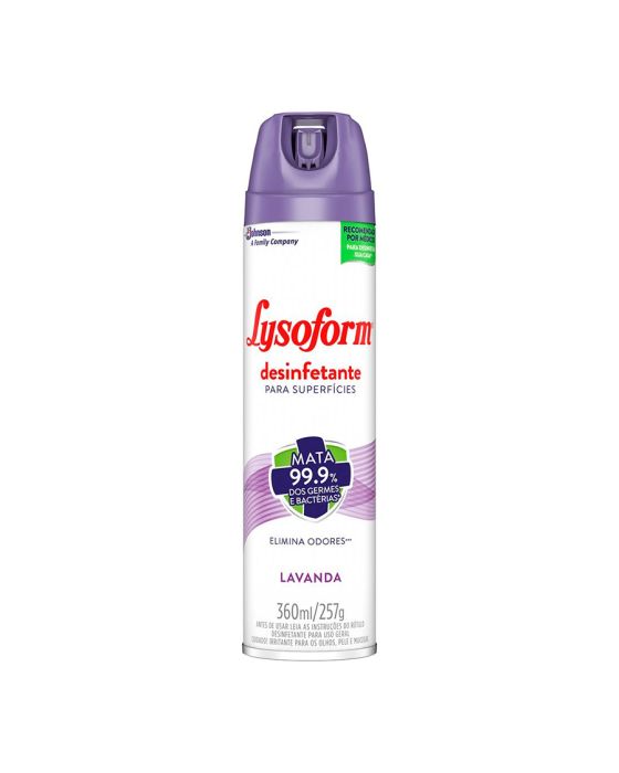 CaracterísticasLysoform Desinfetante Aerossol mata 99,9% dos germes, bactérias, fungos e elimina odores, sendo a solução mais prática para desinfetar superfícies como sofás, cortinas, sapatos, roupas e armários. Mata o vírus H1N1.- Contém 360ml/274g- Fragrância: LavandaInstruções de uso: Agite antes de usar. Segure a embalagem na posição vertical e aplique diretamente sobre as superfícies a serem desinfetadas ou desodorizadas a uma distância de 15 a 20cm. Deixe agir por 10 minutos. Não é necessário usar em excesso. Usar luvas para sua aplicação.Como acionar a trava1. Pressione a parte superior para travar (Close/Cerrar - Fechado).2. Pressione a parte inferior para destravar (Open/Abrir - Aberto).Composição: Ativo, Veículo, Solvente, Propelentes, Fragrância e Inibidores de corrosão.Componente ativo: Ortofenilfenol 0,1%.* As especificações podem ser alteradas sem aviso prévio ** Imagem meramente ilustrativa