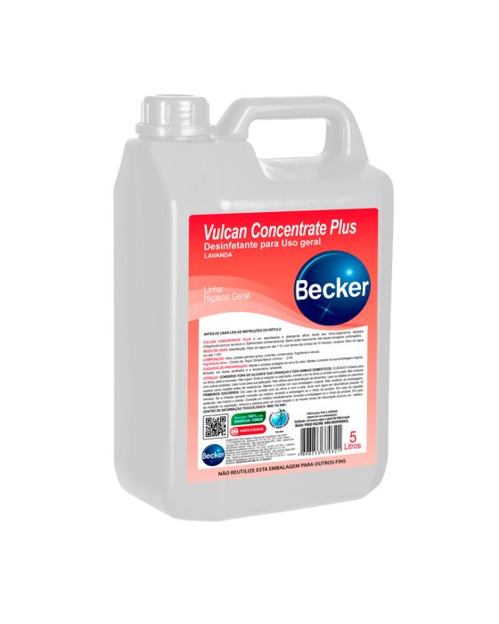 Características:- Desinfecção técnica com ação detergente e alto rendimento: O Desinfetante Concentrado Vulcan Concentrat Plus Lavanda 5L Becker é uma solução profissional desenvolvida para limpeza e desinfecção de ambientes corporativos, industriais e institucionais. Sua formulação combina ação antimicrobiana comprovada contra Staphylococcus aureus e Salmonella choleraesuis com eficiência detergente, garantindo remoção de sujidades, higienização completa e perfume agradável de lavanda. Possui baixo poder espumante, o que reduz o consumo de água e o tempo de enxágue, proporcionando maior produtividade e economia operacional.- Formulação concentrada e de alta performance: O produto é composto por Cloreto de alquil dimetil benzil C12-C14 amônio (2,5% p/p) — agente quaternário de amônio responsável pela ação desinfetante e bactericida — aliado a tensoativo não iônico, que potencializa a remoção de sujidades, além de corante, fragrância e veículo, que garantem estabilidade e aroma agradável durante o uso. Essa combinação torna o produto altamente eficaz na higienização de superfícies laváveis, assegurando limpeza técnica e desinfecção em uma única operação.- Uso prático e diluição econômica: O Vulcan Concentrat Plus Lavanda Becker pode ser utilizado puro ou diluído conforme o tipo de aplicação: Desinfecção: diluir até 1:10 (1 parte do produto para 10 partes de água) e deixar agir por 10 minutos.Limpeza geral: diluir até 1:100 (1 parte do produto para 100 partes de água), garantindo excelente rendimento e economia. Pode ser aplicado com pano, mop, pulverizador ou lavadora automática, sem necessidade de enxágue prolongado, o que o torna ideal para ambientes de grande circulação e operações profissionais de limpeza.- Indicado para uso profissional e institucional: Ideal para empresas de limpeza terceirizada, facilities, indústrias, hotéis, escolas, hospitais e cozinhas industriais, o produto é indicado para pias, azulejos, pisos, bancadas, banheiros e superfícies laváveis em geral. Sua ação simultânea de limpeza e desinfecção elimina micro-organismos, remove sujidades e deixa o ambiente com agradável fragrância de lavanda, promovendo sensação de higiene e bem-estar.- Marca de tradição e confiança: A Becker é reconhecida no mercado de limpeza e cuidados têxteis pela qualidade e eficiência de seus produtos.- Dimensões do produto: Comprimento: 18cm; Largura: 13cm; Altura: 28cm; Peso: 5,183kg. IMPORTANTE! CONSERVAR FORA DO ALCANCE DAS CRIANÇAS E DOS ANIMAIS DOMÉSTICOS.* As especificações podem ser alteradas sem aviso prévio ** Imagem meramente ilustrativa.