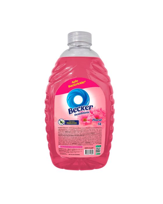 Características:- Higienização profunda e perfume duradouro para ambientes profissionais: O Desinfetante Floral 5L Becker foi formulado para garantir limpeza eficiente e eliminação de micro-organismos, deixando os ambientes higienizados e com agradável fragrância floral. Sua composição atua na desinfecção de superfícies laváveis, sendo ideal para empresas de limpeza, condomínios, hospitais, clínicas, indústrias e estabelecimentos comerciais que demandam alto padrão de assepsia aliado a um aroma suave e refrescante.- Ação bactericida comprovada: O produto possui eficácia comprovada contra Salmonella choleraesuis e Staphylococcus aureus, bactérias comumente presentes em superfícies e áreas de uso coletivo. O princípio ativo cloreto de alquil dimetil benzil amônio (0,15%), aliado ao álcool etoxilado, fragrância, corante e veículo, garante desinfecção segura e eficiente, eliminando germes e odores indesejáveis.- Versatilidade de uso e alto rendimento: O desinfetante Becker pode ser utilizado puro para desinfecção intensa, deixando-o agir por 10 minutos, ou diluído duas colheres de sopa (30ml) para 1 litro de água em limpezas gerais. Essa flexibilidade permite adaptar o uso conforme o nível de sujeira e o tipo de ambiente, oferecendo ótimo custo-benefício para operações de limpeza profissional.- Ideal para ambientes corporativos e institucionais: Recomendado para banheiros, pisos, ralos, pias, azulejos e outras superfícies laváveis, o produto é uma escolha inteligente para hospitais, escolas, redes de varejo, escritórios e prestadores de serviço de higienização, garantindo ambientes limpos, desinfetados e com aroma agradável. Seu volume de 5 litros proporciona excelente rendimento em aplicações de larga escala.- Marca de tradição e confiança: A Becker é reconhecida no mercado de limpeza e cuidados têxteis pela qualidade e eficiência de seus produtos.- Dimensões da embalagem: Comprimento: 18cm; Largura: 13cm; Altura: 28cm; Peso: 5,183kg.IMPORTANTE! CONSERVAR FORA DO ALCANCE DAS CRIANÇAS E DOS ANIMAIS DOMÉSTICOS.* As especificações podem ser alteradas sem aviso prévio ** Imagem meramente ilustrativa.