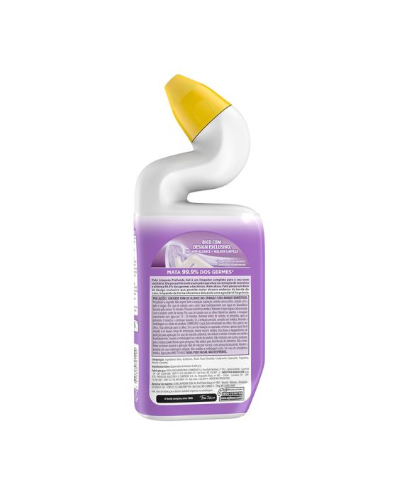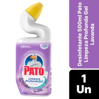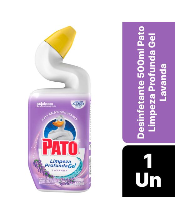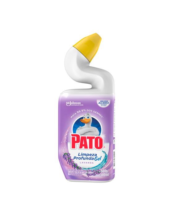 Características:Pato limpeza Profunda Gel é um limpador completo para o seu vaso sanitário. Ele possui fórmula avançada que atua na remoção de manchas e elimina 99,9% dos germes e bactérias. Além disso, Pato possui um bico de design exclusivo que permite maior alcance embaixo da borda do vaso, limpando de forma eficiente e deixando uma agradável fragrância!Detalhes:- Marca: Pato;- Fabricante: SC Johnson;- Modelo: Limpeza Profunda;- Linha: Desinfetantes;- Tipo: Gel;- Fragrância: Lavanda;- Volume/Peso: 500g / 500ml;- Contém: 1 unidade do produto;- Mata 99,9% dos germes*;- Bico com design exclusivo, melhor alcance = melhor limpeza;- Melhor alcance na borda do vaso;- Água pode faltar, não desperdice.Indústria Brasileira. | Validade: 24 meses após a data de fabricação.Modo de uso:- Levante o assento do vaso sanitário;- Para remover a tampa, aperte as duas superfícies laterais texturizadas e desenrosque completamente;- Direcione o produto sob a borda e aperte uniformemente ao redor do vaso;- Esfregue em cima e embaixo da linha d’água. Deixe-o agir por pelo menos 10 minutos e dê descarga;- Para melhores resultados, reaplique o produto, deixando agir por mais 60 minutos, antes de dar descarga novamente;- Recoloque a tampa e feche, apertando-a até ouvir o clique.Recomendações :- Manter o produto em sua embalagem original;- Não reutilize a embalagem original;- Não reutilize a embalagem vazia;- Não misture com produtos que contém alvejante ou outros produtos químicos caseiros, porque a mistura pode liberar gases tóxicos.Composição:- Quaternário de Amônio 0,46% p/p, Acidulante, Álcool Graxo Etoxilado, Coadjuvante, Espessante, Fragrância, Veículo e Corante.Medidas:- Dimensões do produto: 9 x 4,5 x 23,4cm (CxLxA);- Peso: 529g.* Staphylococcus aureus e Salmonella choleraesuis.ATENÇÃO! CONSERVE FORA DO ALCANCE DAS CRIANÇAS E DOS ANIMAIS DOMÉSTICOS.* As especificações podem ser alteradas sem aviso prévio ** Imagem meramente ilustrativa.